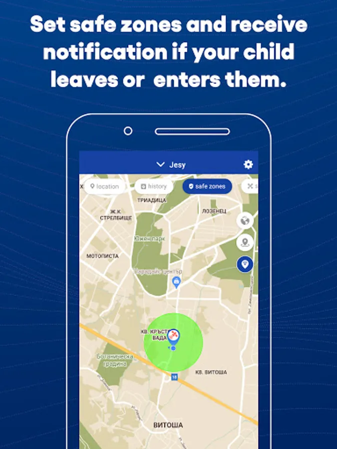 You can set up to five Safe Zones using a radius from 50 m - 5km, in which you know your child is secure. You will receive a push notification immediately if the device enters or leaves the perimeter of the Safe zone. An additional Wi-Fi Safe zone can be set to notify you if your child leaves the Wi-Fi area.