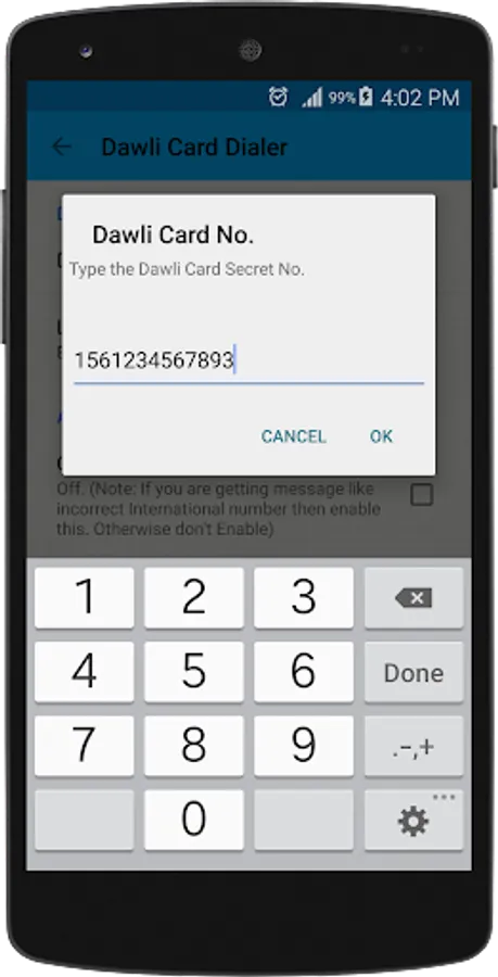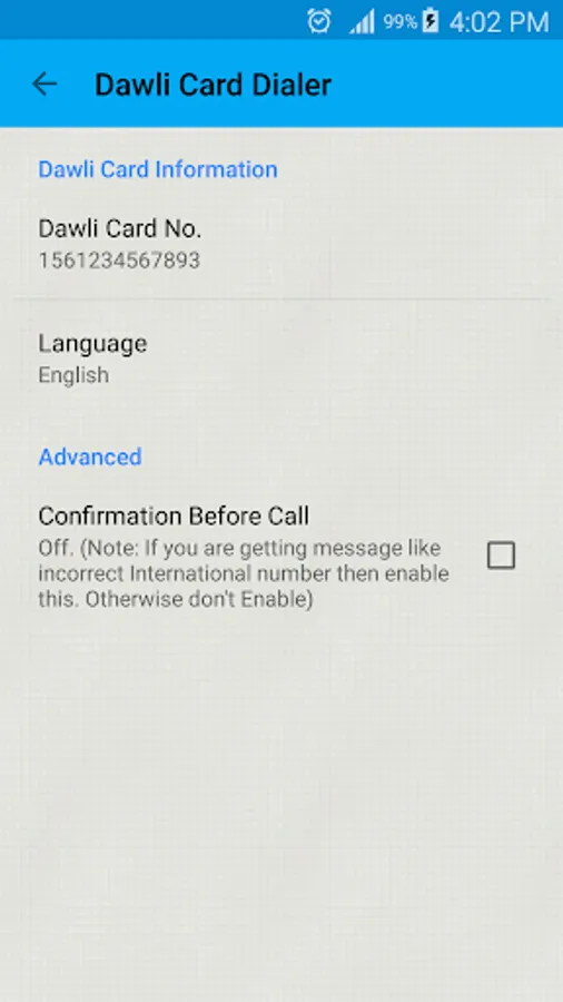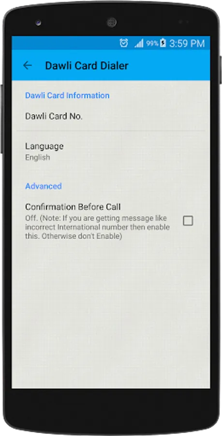 * Dawli Card Dialer will store your Dawli Calling Card Number in application,