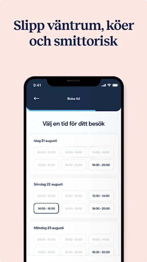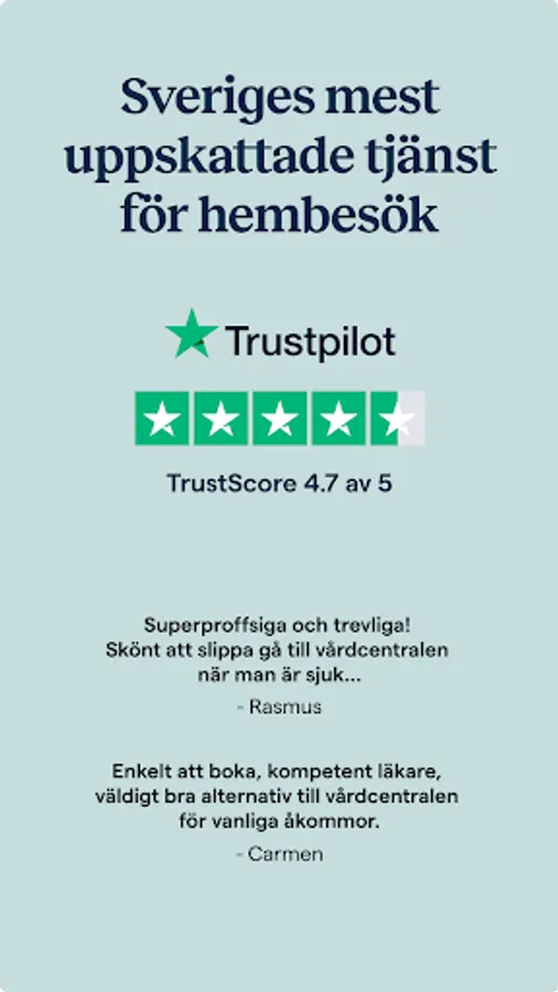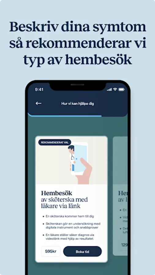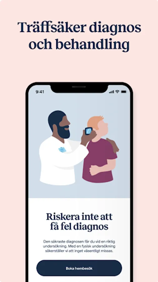Download the app and log in safely and securely with BankID. Fill in your profile, answer a health survey and get one of our services recommended based on your symptoms. Choose a time, confirm that all information is correct and pay by card or Klarna directly in the app. One of our doctors or nurses will then come to your home at the appointed time.