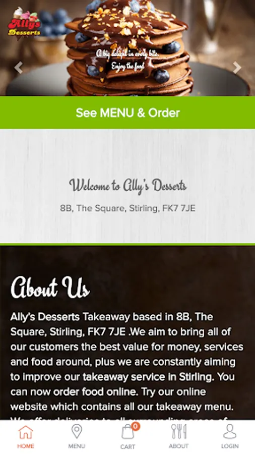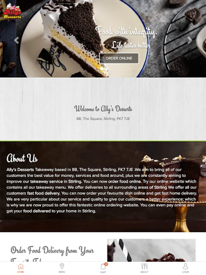 Ally’s Desserts Takeaway based in 8B, The Square, Stirling, FK7 7JE .We aim to bring all of our customers the best value for money, services and food around, plus we are constantly aiming to improve our takeaway service in Stirling. You can now order food online. Try our online website which contains all our takeaway menu. We offer deliveries to all surrounding areas of Stirling We offer all our customers fast food delivery. You can now order your favorite dish online and get fast home delivery. We are very particular about our service and quality to give our customers a better experience; which is why we are now proud to offer this fantastic online ordering website. You can even pay online and get your food delivered to your home in Stirling.