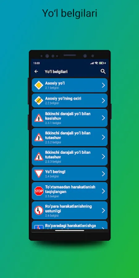 - Yo'l belgilari va belgilari: tavsifga ega bo'lgan joriy yo'l belgilari ro'yxati