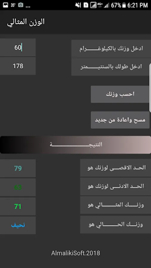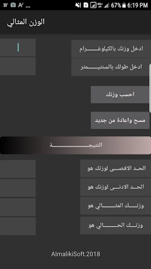 The program aims to calculate the body weight based on height entrance to the show as a result of maximum and minimum weight, to show the perfect weight, show the current weight Ksameen, very fat, skinny or too skinny, or an ideal weight.