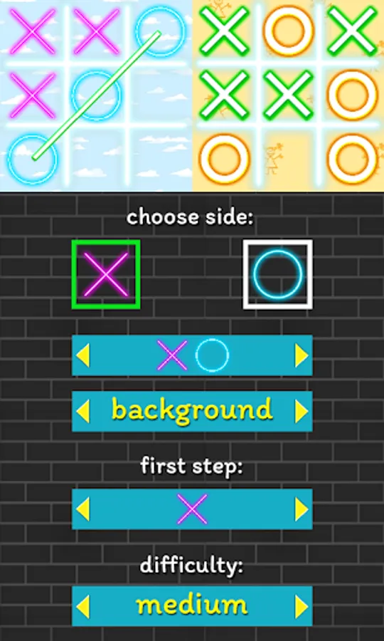 • Exciting xo game board designs where you can choose noughts and crosses graphics set, first move options, backgrounds.