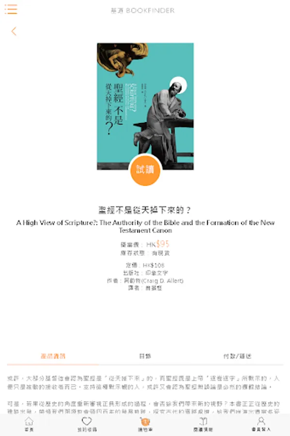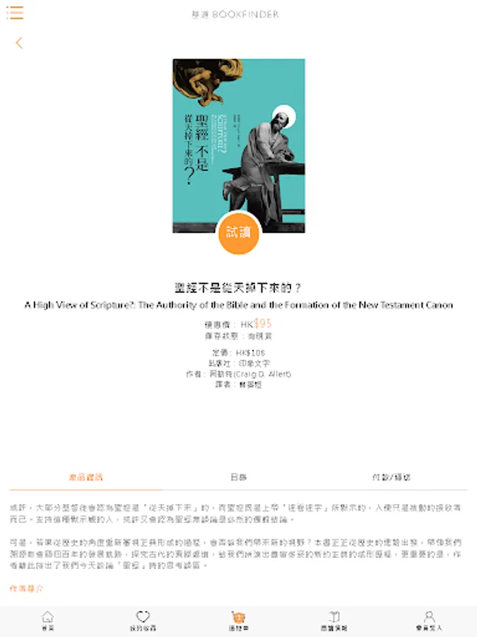 • 集結過萬冊華文基督教港台書籍,盡力提供書籍目錄、作者簡介及試讀等資料,提供一站式的搜書、選書、購書服務。