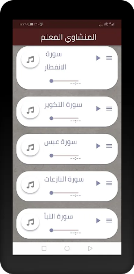 The application of the Qur’an teacher to Muhammad Minshawi Juz Amma with chanting audio, Juz Amma recited (Surat An-Nas, Surat Al-Falaq, Surat Al-Ikhlas, Surat Al-Masd, Surat Al-Nasr, Surat Al-Kafirun, Surat Al-Kawthar, Surat Al-Ma’un, Surat Quraish, Surat Al-Fil, Surat Al-Amza, Surat Al-Asr Surat Al-Takathur, Surat Al-Qari’ah, Surat Al-Adiyat, Surat Al-Zalzalah, Surat Al-Bayinah, Surat Al-Qadr, Surat Al-Alaq, Surat Al-Tin, Surat Al-Sharh, Surat Al-Dhaha, Surat Al-Shams, Surat Al-Layl, Surat Al-Balad, Surat Al-Fajr, Surat Al-Ghashiah, Surat Al-Ala, Surat Al-Tariq, Surat Al-Buruj, Surat Al-Inshiqaq, Surat Al-Mutaffifin, Surat Al-Anftar, Surat Al-Takwir, Surat Abs, Surat Al-Naza’at, Surat Al-Naba’)