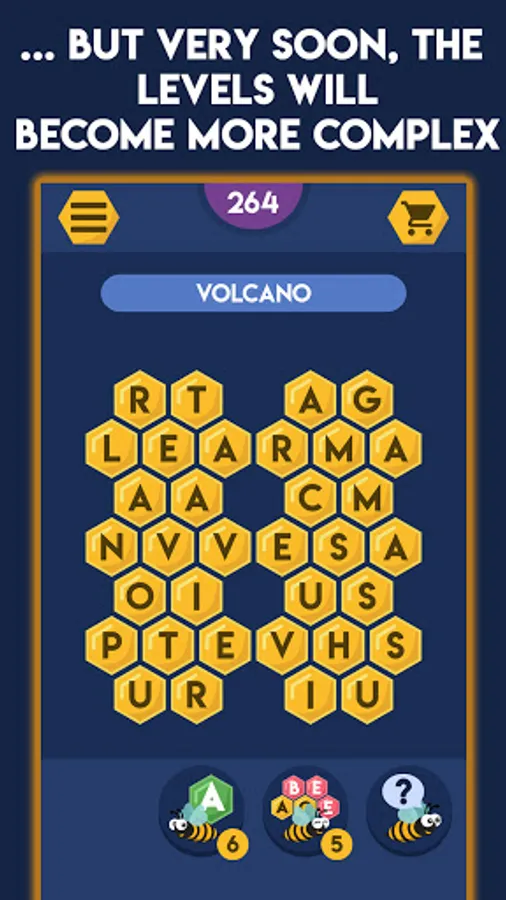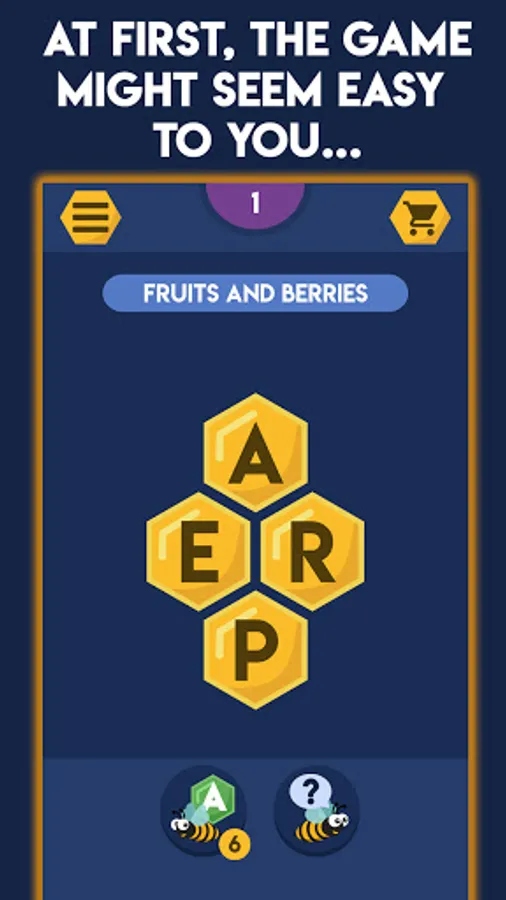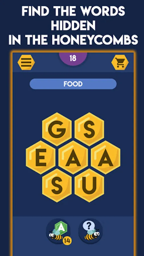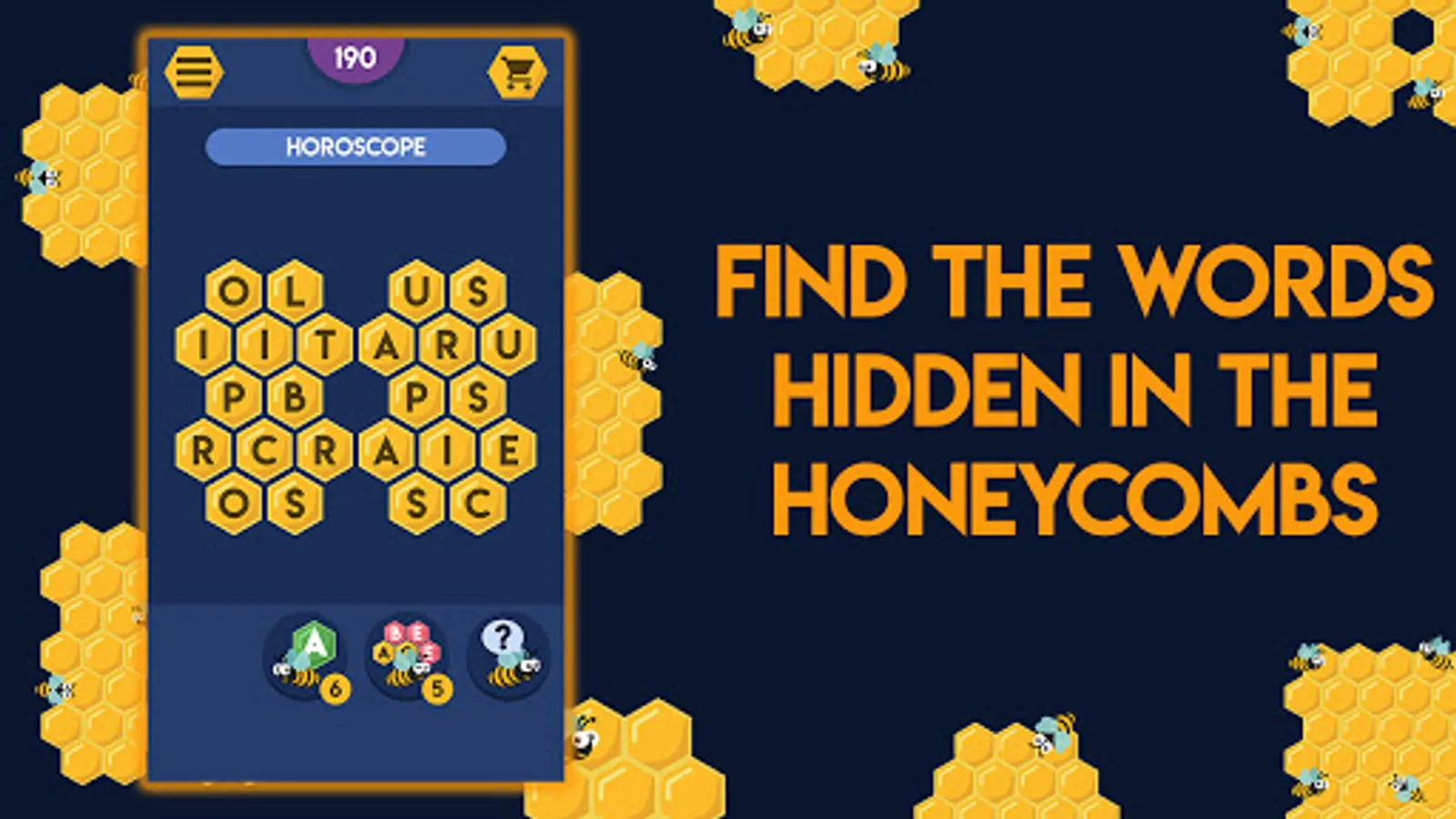 You will have to find words hidden on the game board. The word game has a bee theme, and the game board with letters is reminiscent of beehive honeycombs.
