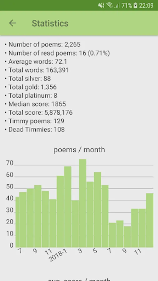 Statistics, including number of words, median score... and graphs are available by selecting "statistics" in the menu.