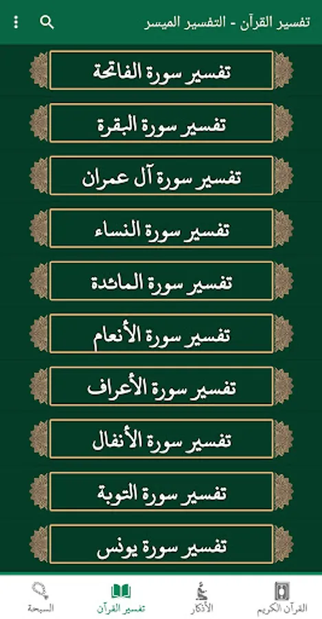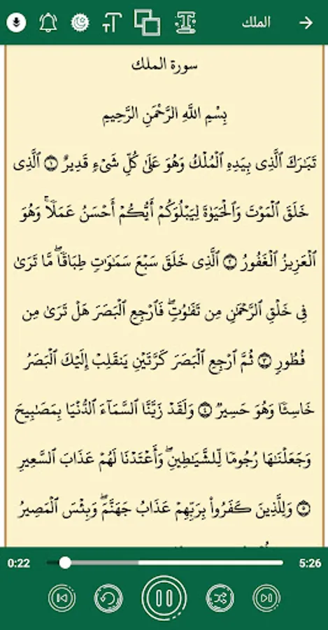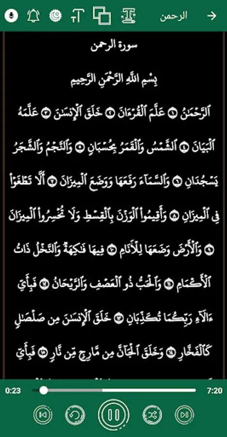 By pressing the (Next Surah) and (Previous Surah) button, you can listen to the previous surahs of the surah you are listening to, as well as the following surahs. The program also shows you the duration of each surah so that you are aware of this.