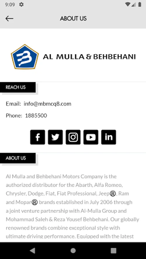 Al Mulla & Behbehani Motor Company WLL is the authorized distributor for Alfa Romeo, Abarth, Chrysler, Dodge, Fiat, Jeep ®, Ram and Mopar ® brands. Established in April 2006 through a joint venture partnership by Al-Mulla Group (at the time Distributor for Chrysler and Dodge brands for 40 years) and Behbehani Jeep Motor Company (at the time Distributor for Jeep brand for 16 years), Al Mulla & Behbehani has continued to excel each year. With decades of automotive experience behind the two companies, the unification of the sales and service offered operations the opportunity to increase market share as well as providing added value to customers in terms of enhancing service levels throughout the operations.
