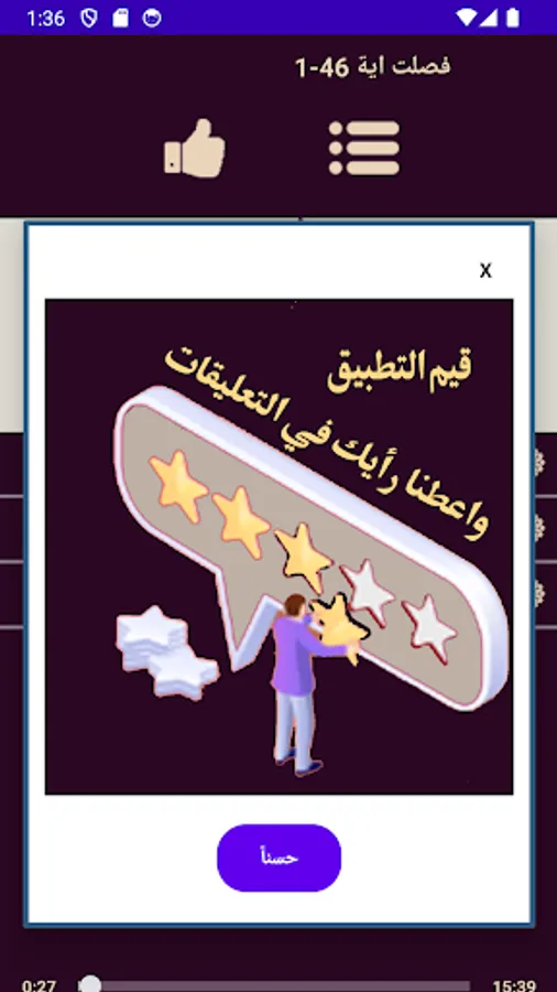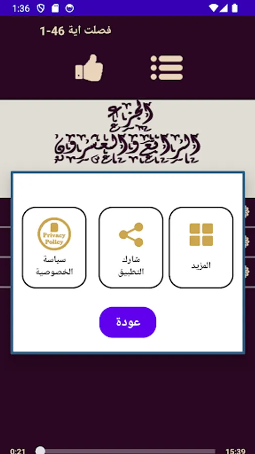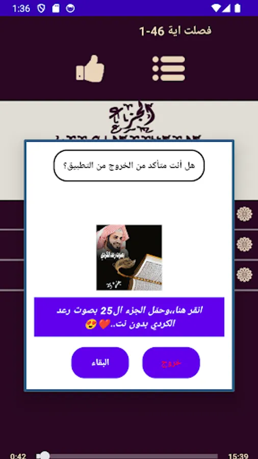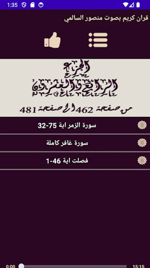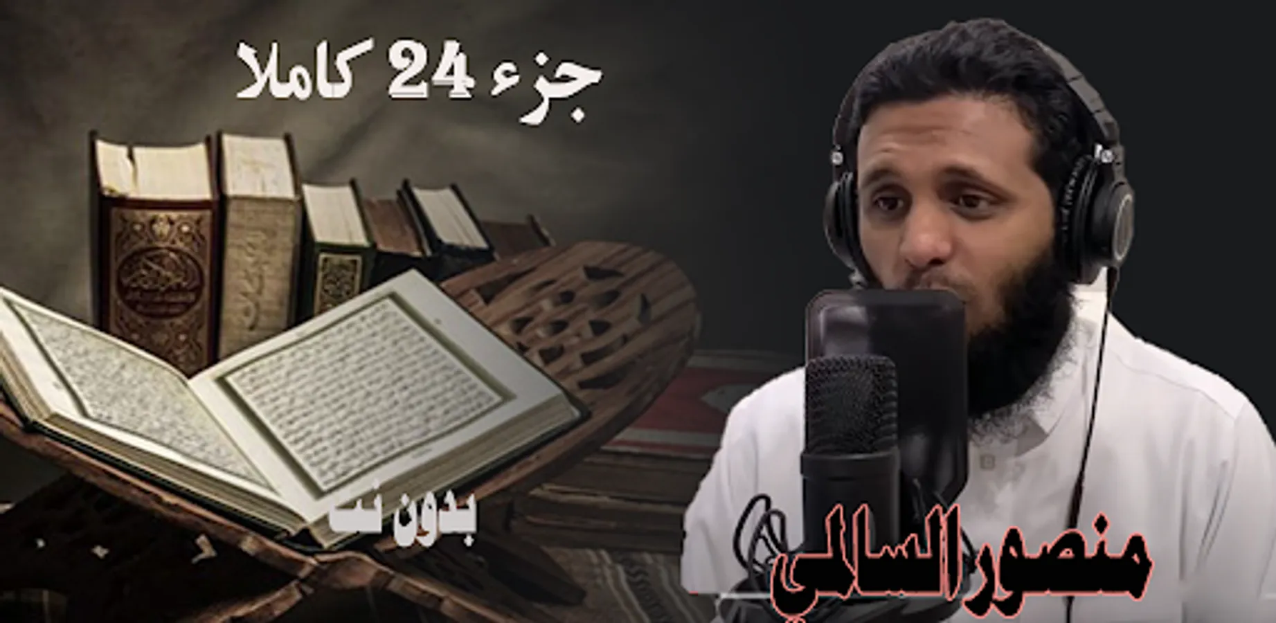 The application contains the Noble Qur’an, Part 24 from page 481-462, with the voice of Mansour Al-Salmi