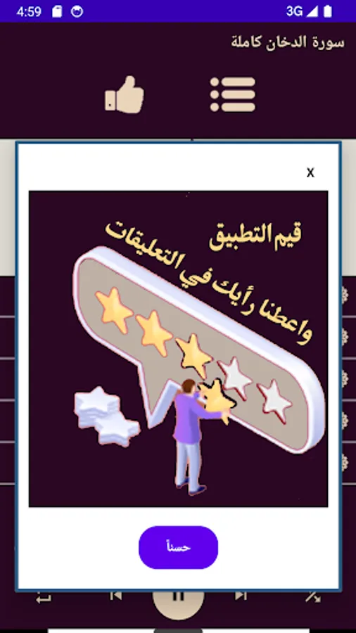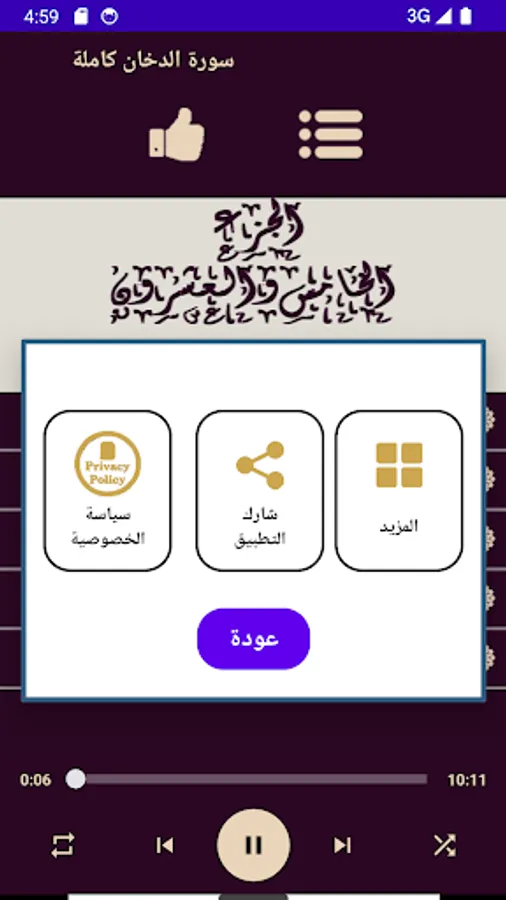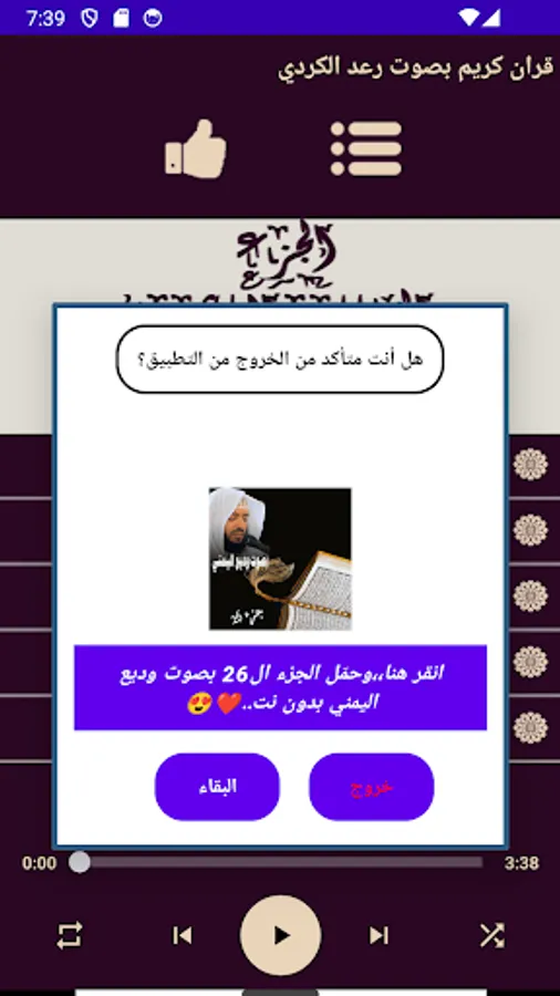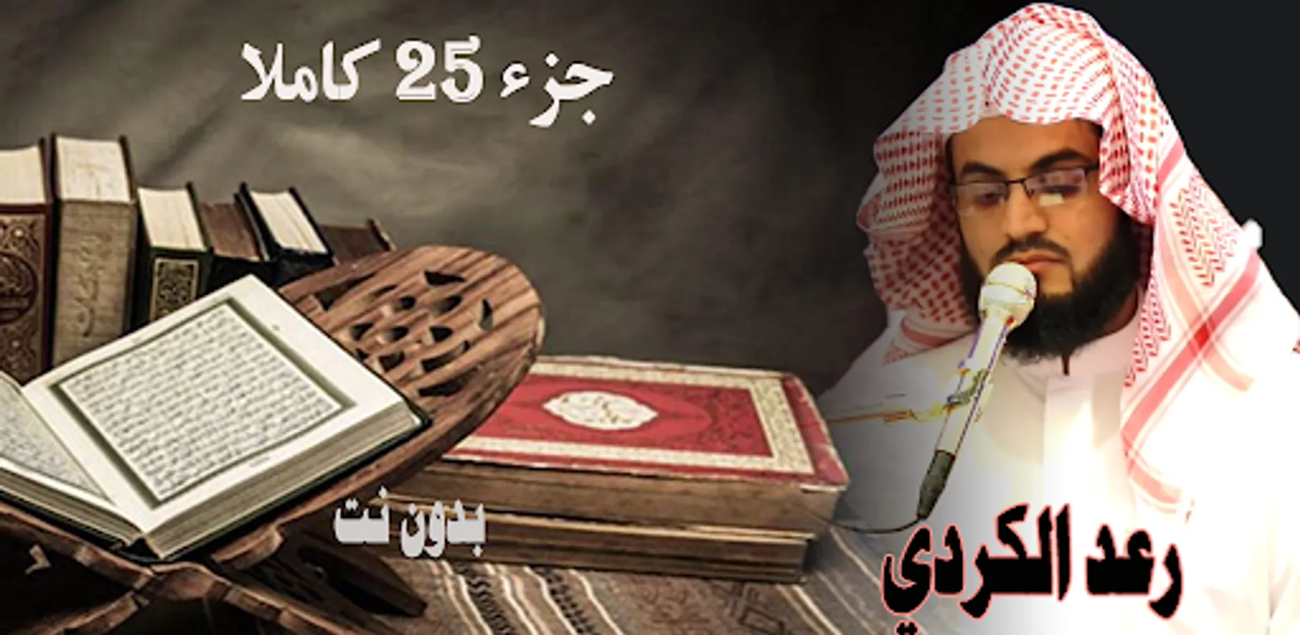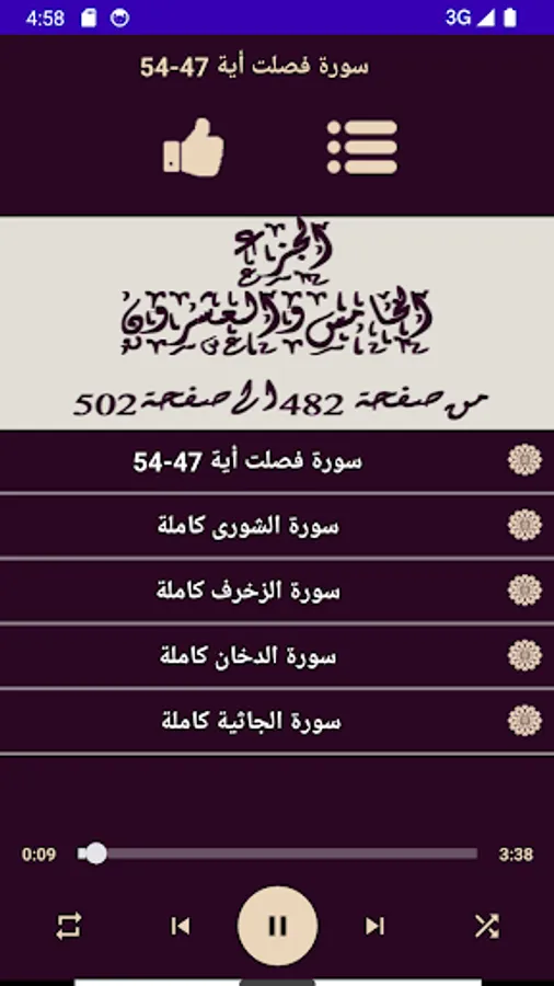 The application contains the Noble Qur’an, Part 25 of page 482-502, with the voice of Raad Al-Kurdi