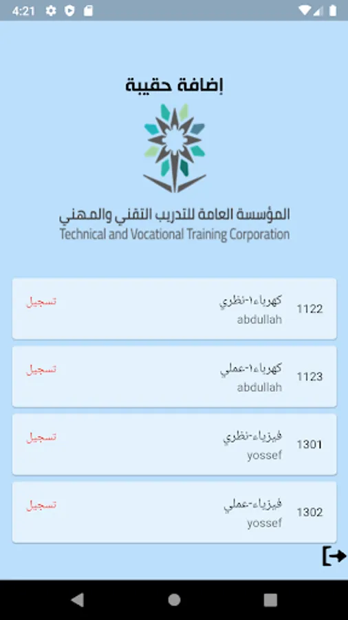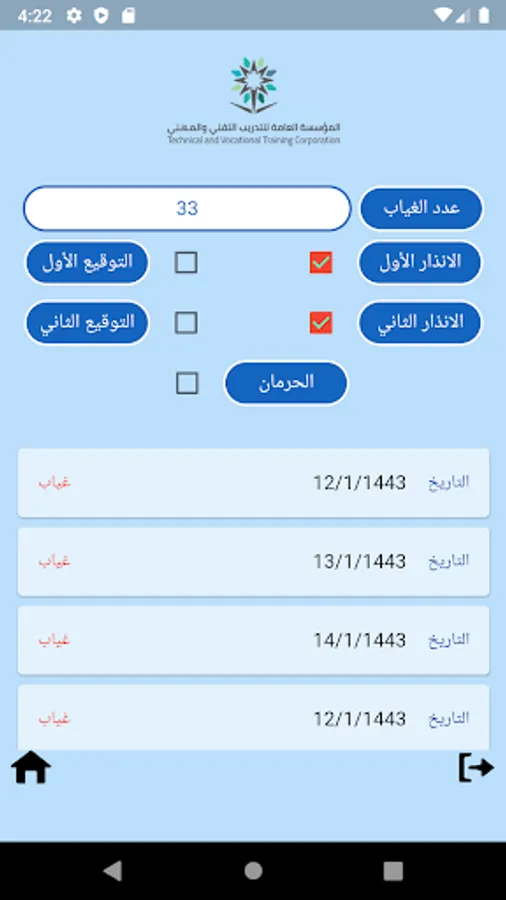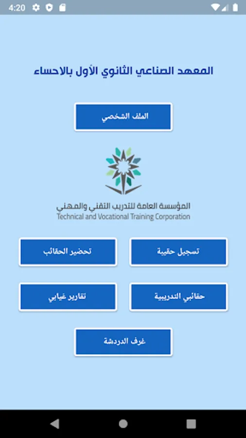 An application for the First Secondary Industrial Institute in Al-Ahsa, where the application contains a database of trainees and trainers. The application monitors the attendance of trainees in each training bag and issues warnings in the absence of trainees and sends messages to parents and chat rooms to communicate between the trainer and his trainees and others