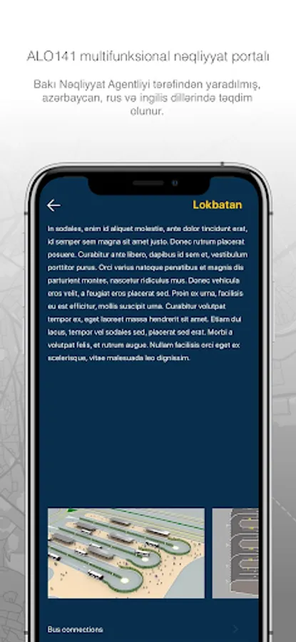 Dördüncü bölmə AVTOBUSLAR bölməsidir ki, burada, istənilən marşrutun nömrəsini seçməklə, xəritədə həmin marşrutun getdiyi yolu, əsas dayanacaqları və xəttin uzunluğunu görmək olar.
