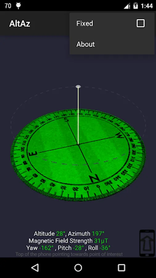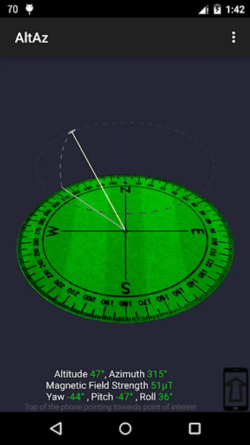 The app shows you a 3d representation of the direction (bearing) . It acts as a compass and shows you North, South, East and West along with other intermediate directions. The altitude of the object being pointed is shown and can be used as a sextant. Long press to take a snapshot of the Altitude and Azizmuth readings.