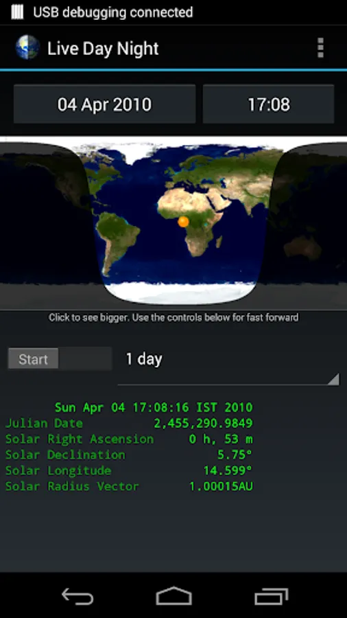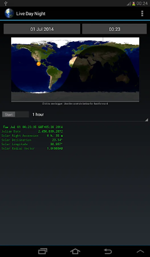 A Live wallpaper showing the extent of Day and night right on your screen. Also available as an image to zoom in. Custom dates and time. Shows Julian Date, Solar Right ascension, declination, longitude and radius vector.