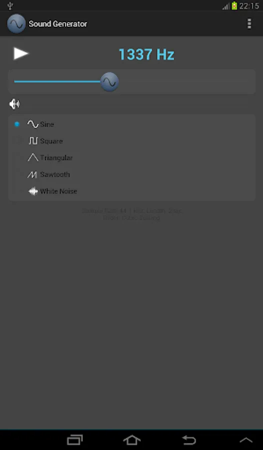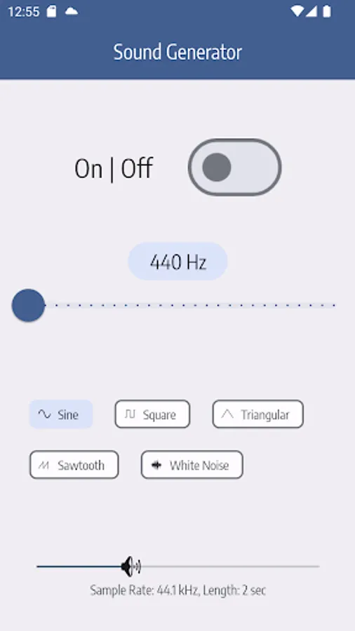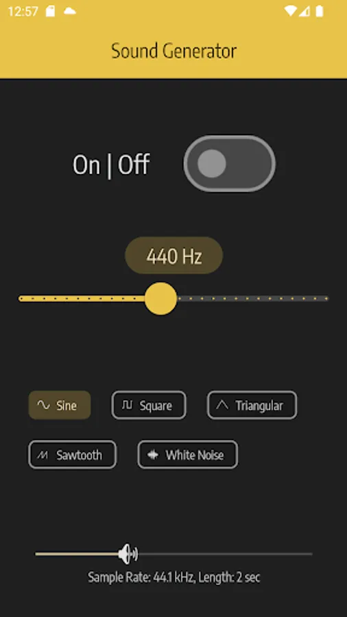 Sound Generator enables you to generate sounds of any frequency! You can change the frequency and the volume of the sound being generated. Use the play/pause button to start/stop the generated sound.