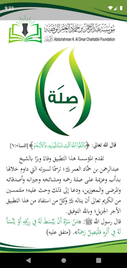 The Foundation provides this application in loyalty to Sheikh Abdulrahman bin Hammad Al-Omar; A drawing of his life, during which he persevered diligently and resolutely in connection with his mercy, his sheikhs, his neighbors, his friends, the sick and the needy, and called for and urged him to do so;