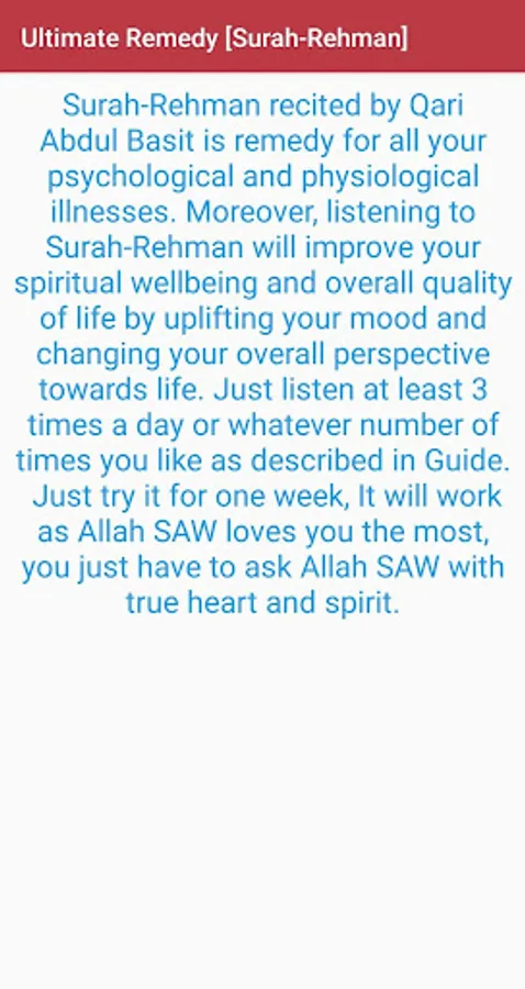 Surah-Rehman recited by Qari Abdul Basit is remedy for all your psychological and physiological illnesses. Moreover, listening to Surah-Rehman will improve your spiritual wellbeing and overall quality of life by uplifting your mood and changing your overall perspective towards life. Just listen at least 3 times a day or whatever number of times you like as described in following method: