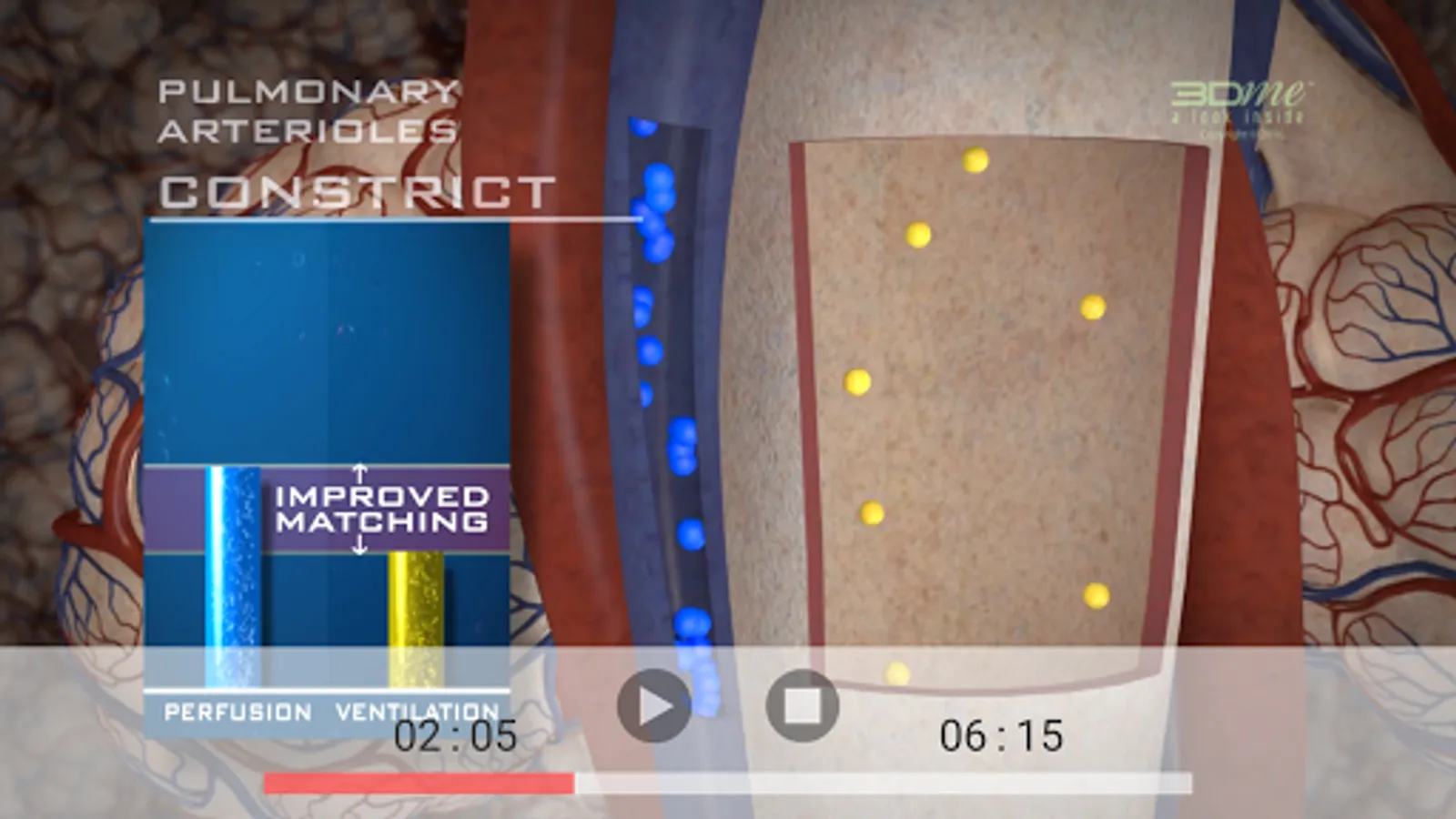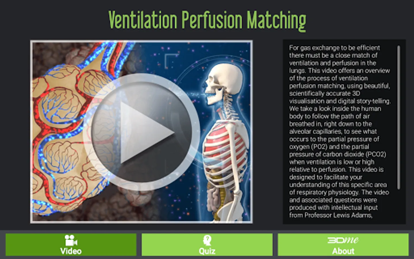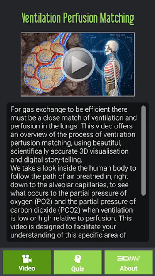 For gas exchange to be efficient there must be a close match of ventilation & perfusion in the lungs. This App contains a 3D video which offers an overview of the process of ventilation perfusion matching, using beautiful, scientifically accurate 3D visualisation & digital story-telling. We take a look inside the human body to follow the path of air breathed in, right down to the alveolar capillaries, to see what occurs to the partial pressure of oxygen (PO2) & the partial pressure of carbon dioxide (PCO2) when ventilation is low or high relative to perfusion.