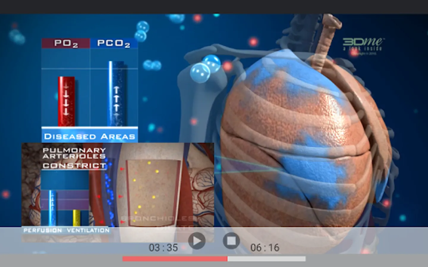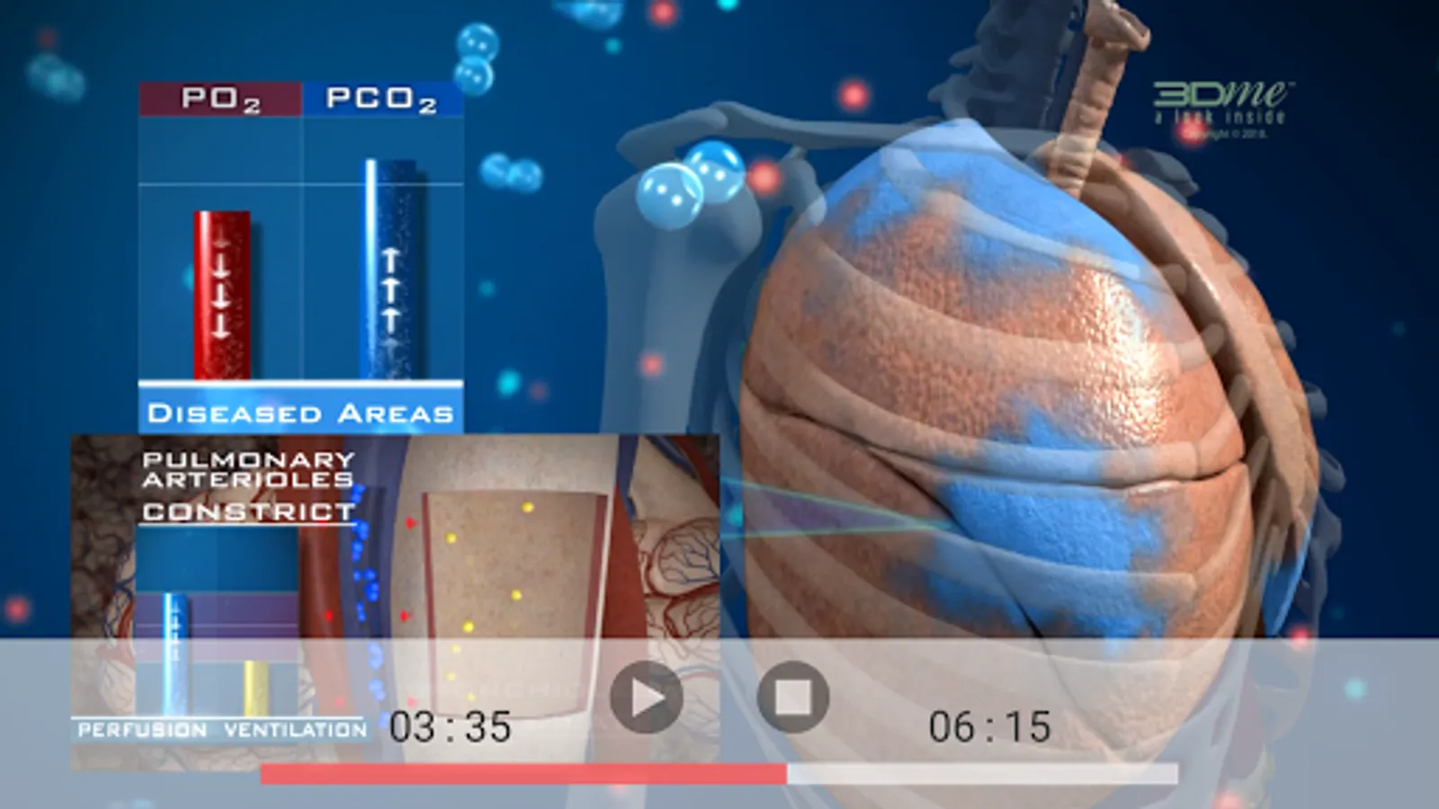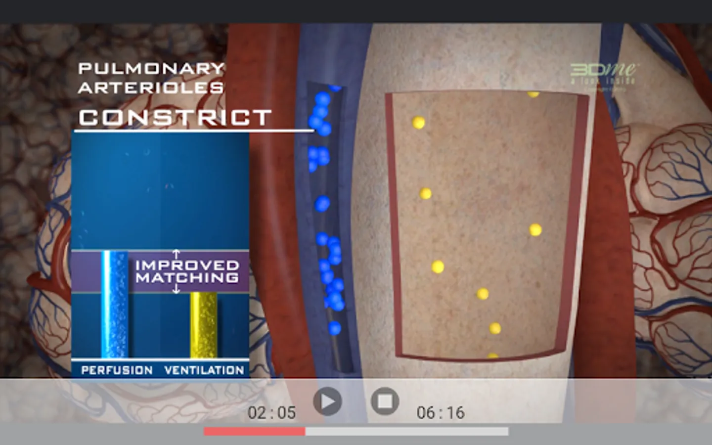 For gas exchange to be efficient there must be a close match of ventilation & perfusion in the lungs. This App contains a 3D video which offers an overview of the process of ventilation perfusion matching, using beautiful, scientifically accurate 3D visualisation & digital story-telling. We take a look inside the human body to follow the path of air breathed in, right down to the alveolar capillaries, to see what occurs to the partial pressure of oxygen (PO2) & the partial pressure of carbon dioxide (PCO2) when ventilation is low or high relative to perfusion.