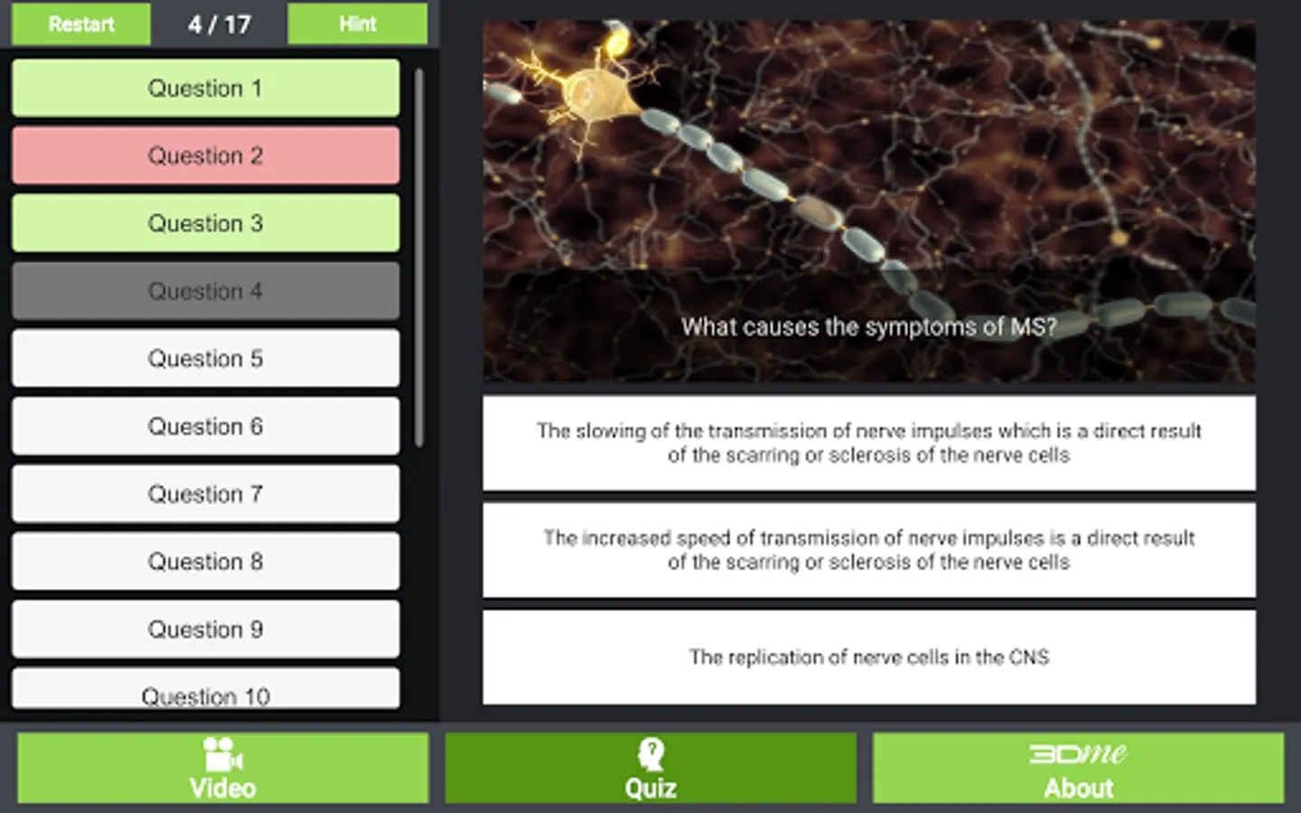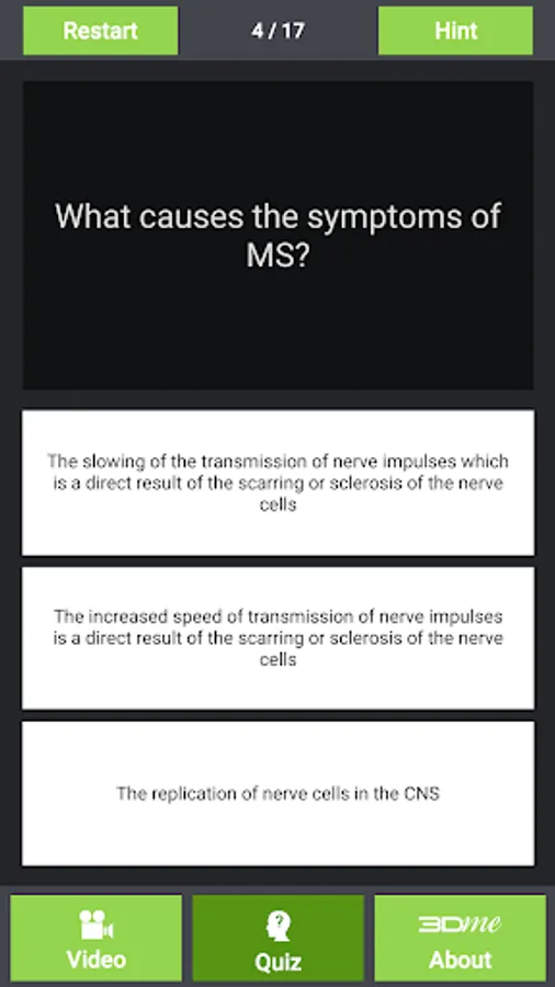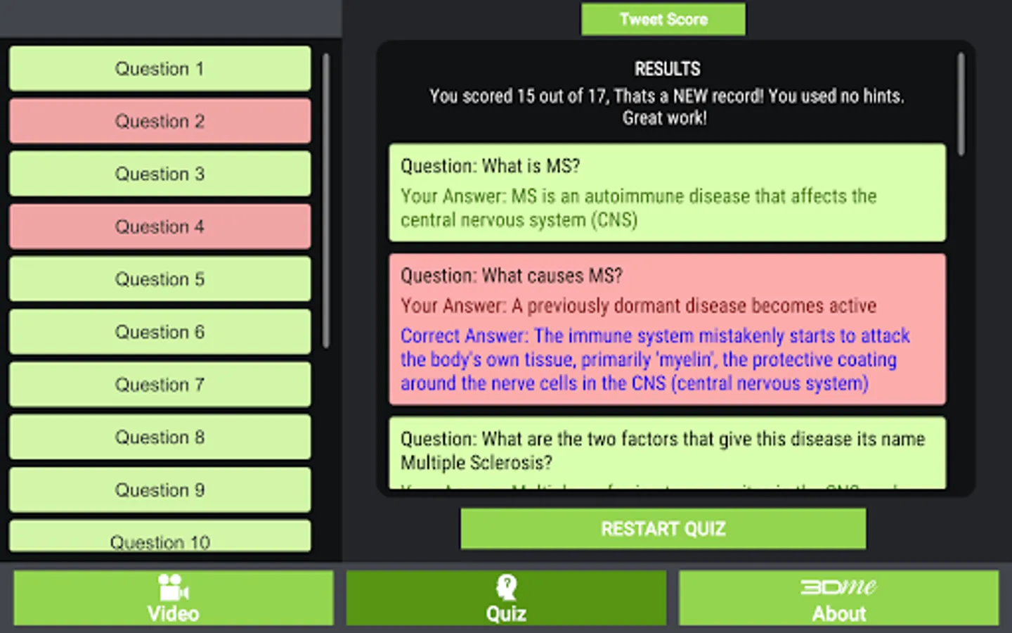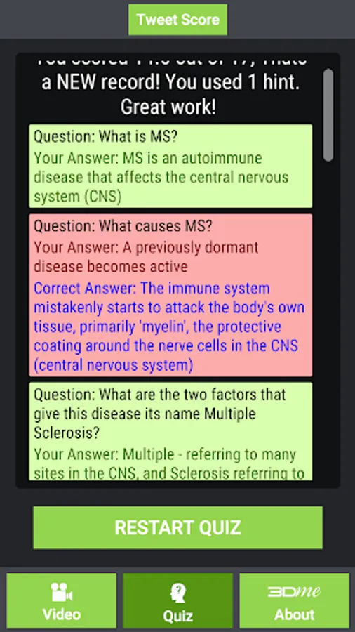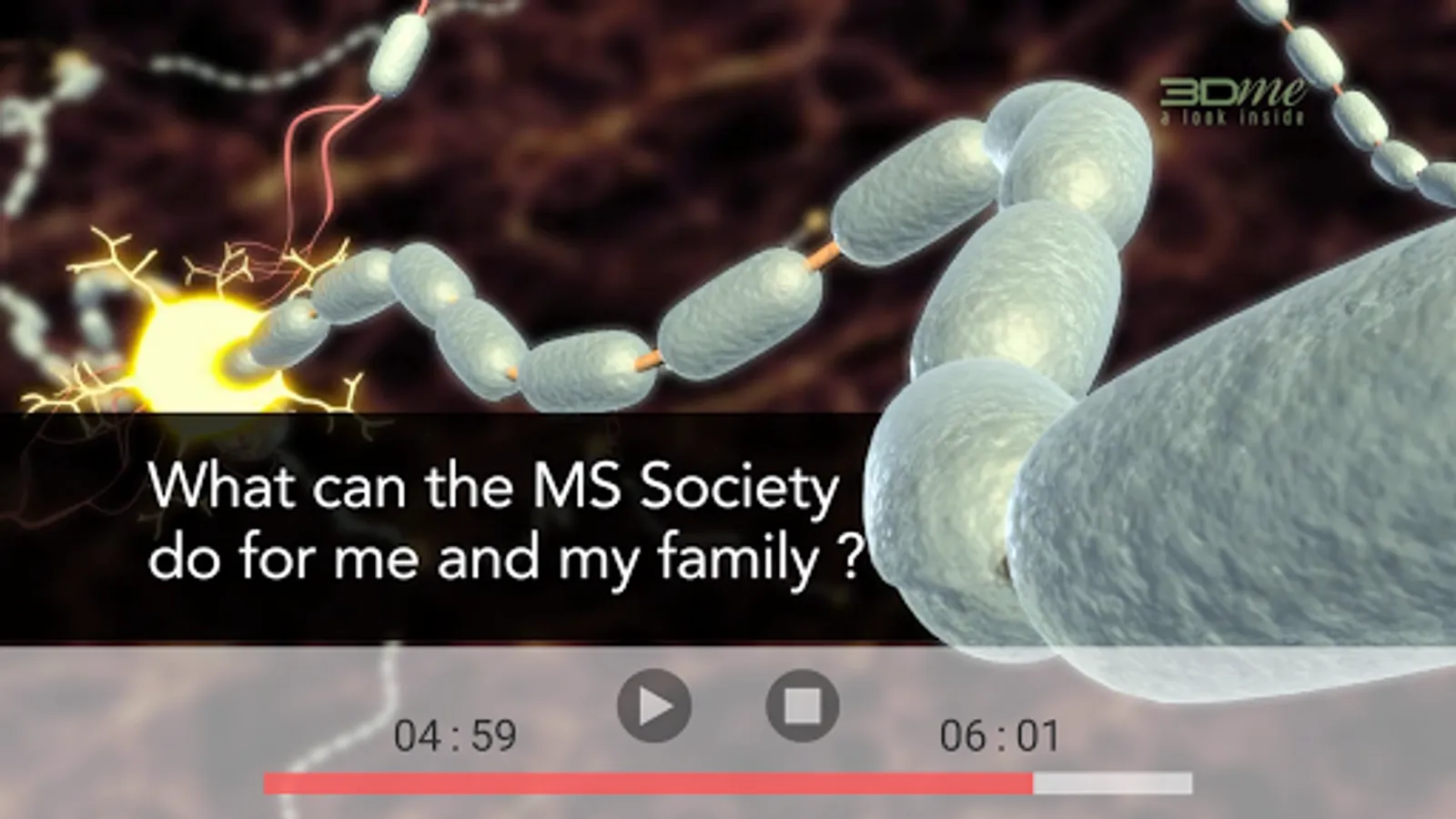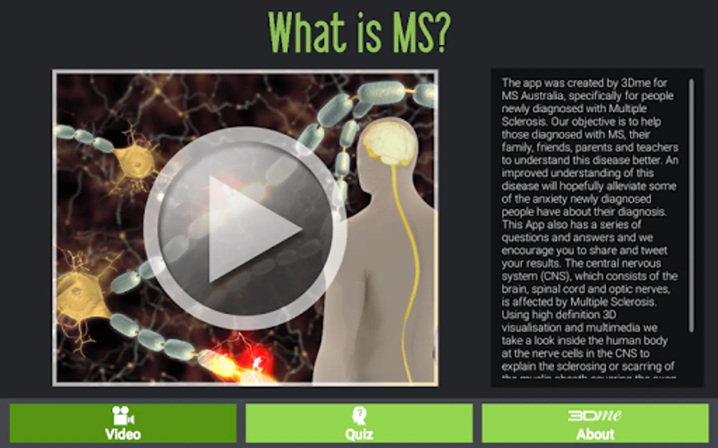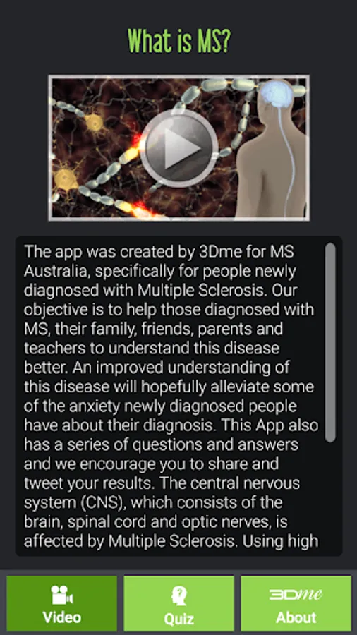 The video in this App was specifically created for people newly diagnosed with Multiple Sclerosis. The objective of the video is to help those diagnosed with MS, their family, friends, parents and teachers to understand this disease better. An improved understanding of this disease will hopefully alleviate some of the anxiety newly diagnosed people have about their diagnosis. This App also has a series of questions and answers and users are encouraged to share and tweet their results.
