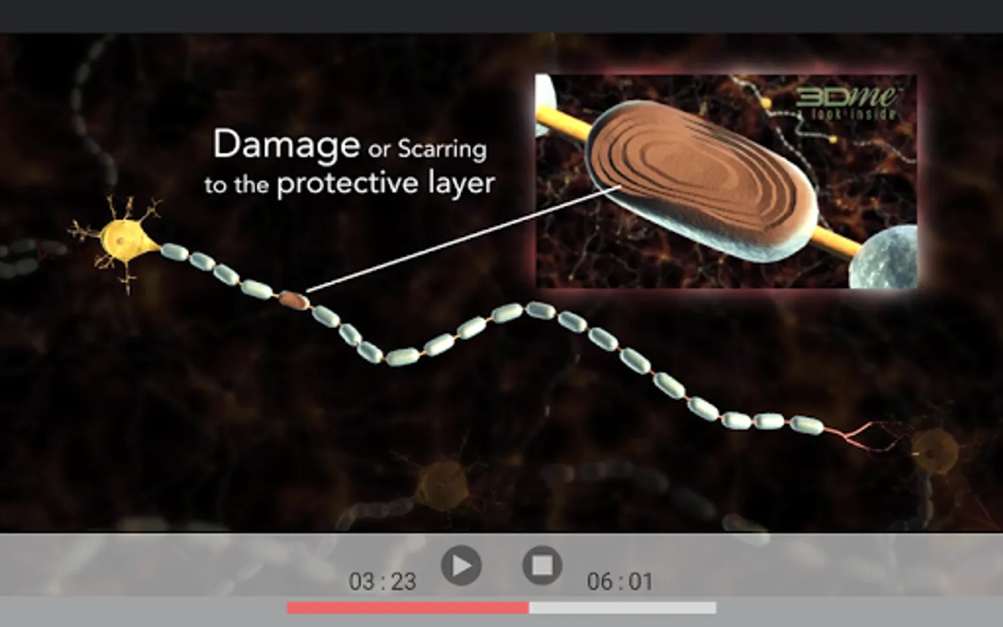 The central nervous system (CNS), which consists of the brain, spinal cord and optic nerves, is affected by Multiple Sclerosis. Using high definition 3D visualisation and multimedia we take a look inside the human body at the nerve cells in the CNS to explain the sclerosing or scarring of the myelin sheath covering the axon of the oligodendrocyte (nerve cell). This sclerosing causes the transmission of nerve impulses to be slowed or dissipated.