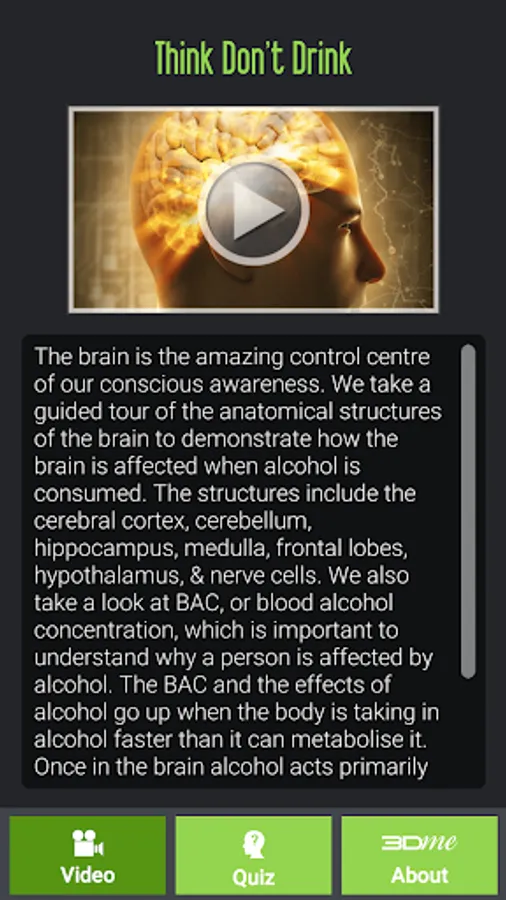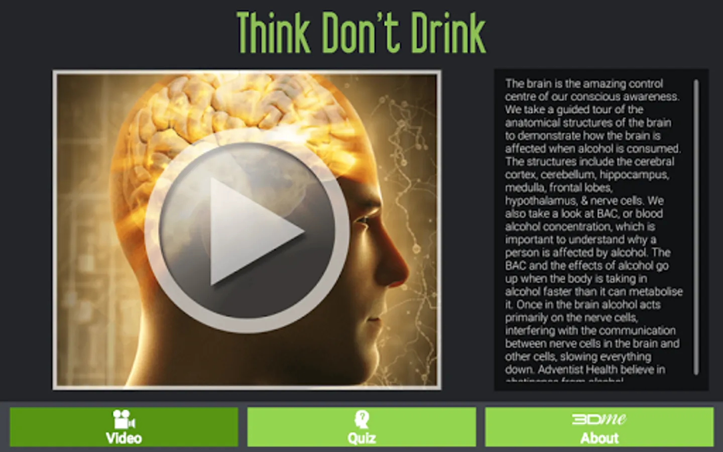 The brain is the amazing control centre of our conscious awareness. This health education App from the 'Consider Your Health' series contains a 10 minute video with captivating 3D animations, voiceover & graphics. It takes you on a guided tour of the anatomical structures of the brain, to demonstrate the structures affected when alcohol is consumed. These include the cerebral cortex, cerebellum, hippocampus, medulla, frontal lobes, hypothalamus, & nerve cells. We also take a look at BAC, or blood alcohol concentration, which is important to understand why a person is affected by alcohol. The BAC and the effects of alcohol go up when the body is taking in alcohol faster than it can metabolise it. Once in the brain alcohol acts primarily on the nerve cells, interfering with the communication between nerve cells in the brain and other cells, slowing everything down. Adventist Health believe in abstinence from alcohol.