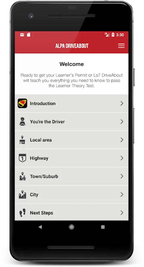 Alpa DriveAbout is a world-first learner licensing app, featuring highly engaging animated content with a built-in test. Alpa DriveAbout will take you on a five-part journey to learn everything you need to know to pass the Learner Permit test (Ls test) in South Australia, Western Australia, Queensland and the Northern Territory.