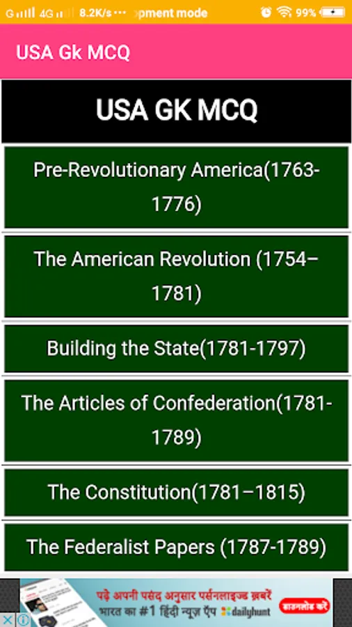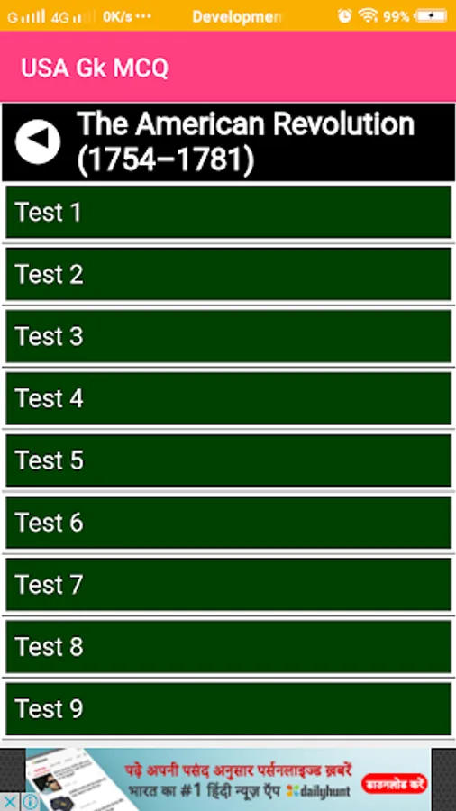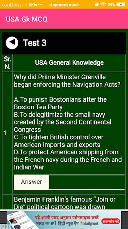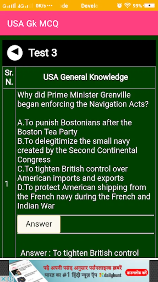 Random questions of History, Geography, Sports, Presidents and Constitution will be displayed on each time of Quiz Start.