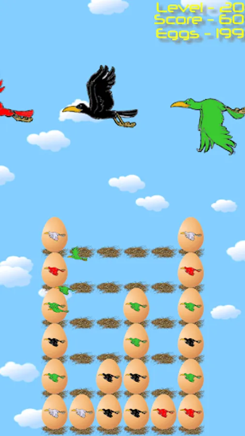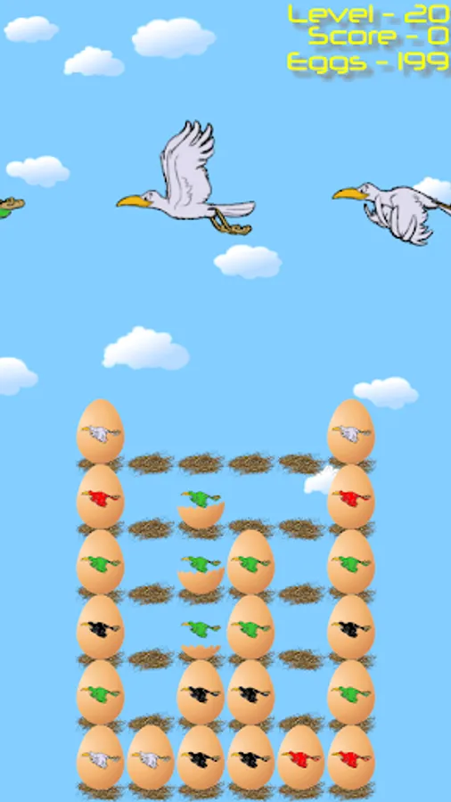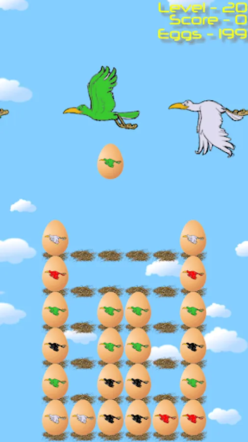 Egg catching game to drop eggs from flying birds and hatching them by making pairs of three or more eggs of same color.