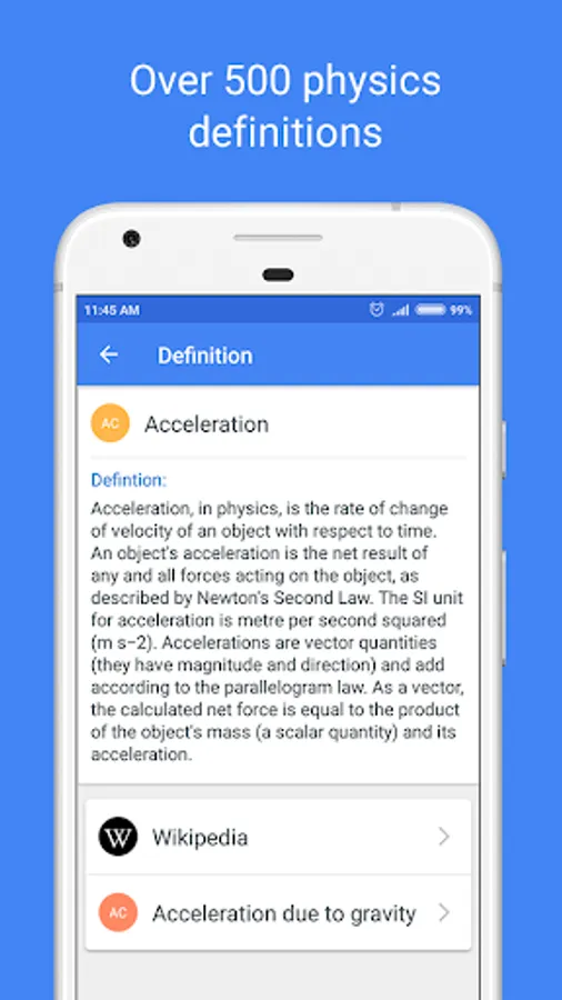 Physics dictionary which contains over 500 physics definitions or terms. All definitions are briefly explained with simple language and equipped with a reference to Wikipedia. User can switch between all and basic definitions for ease.