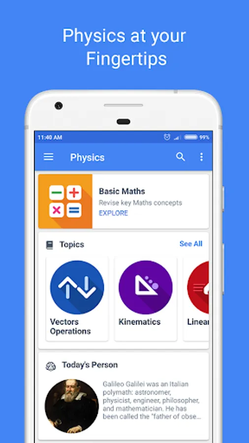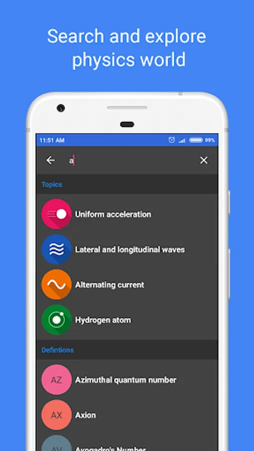 Search anything you want to know and explore the physics world. Users can search topics, definitions, formulas and physicists to get results instantly.