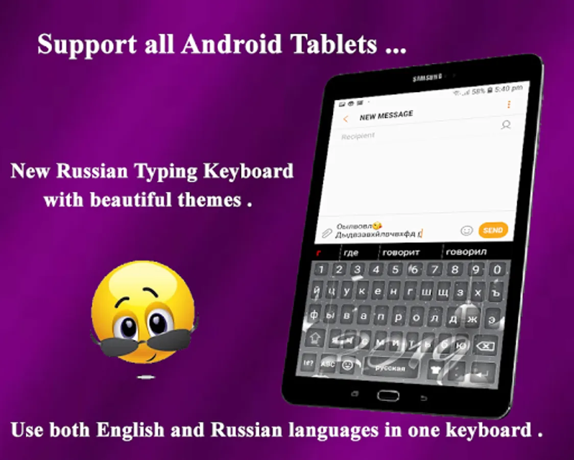 Russian Keyboard is our new mobile keyboard for Android, created just for stylish keyboard lover! Our Russian Keyboard will completely change the way you type your Russian text messages in the Russian language. Russian font Keyboard is a two- Russian language keyboard English and Russian language, Russian keyboard with cool Russian fonts, Stylish Keyboard themes, Emojis and autocorrects input and word predictions. Install Fast Typing Russian Keyboard now and start enjoying its awesome features and unique designs! Don't forget to share this fancy Russian Language keyboard with your friends, so they can have more fun with their phones too.