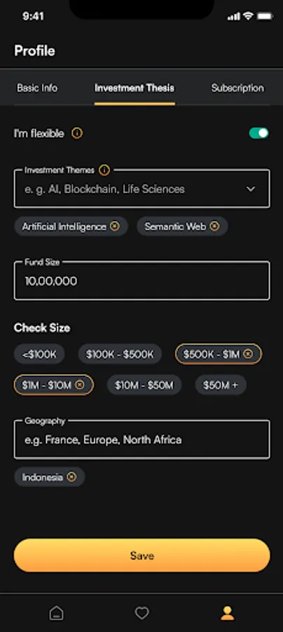 As an investor, you will be able to define an investment thesis, which will be utilized to provide you with precise matches that perfectly complement your portfolio.