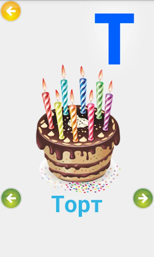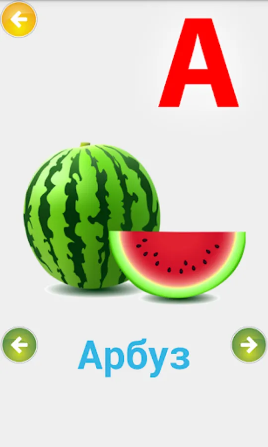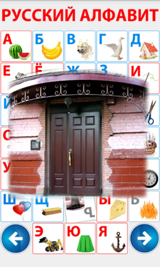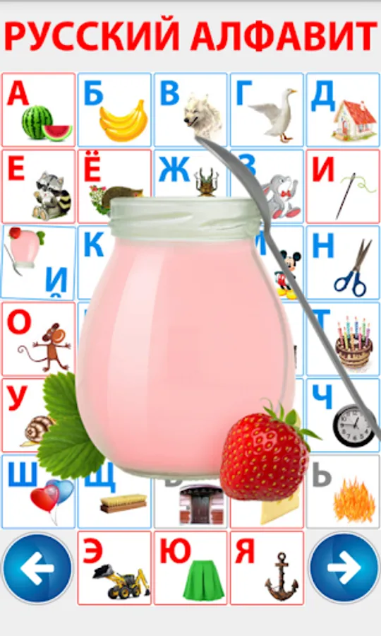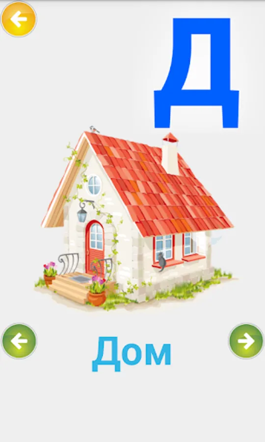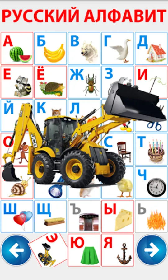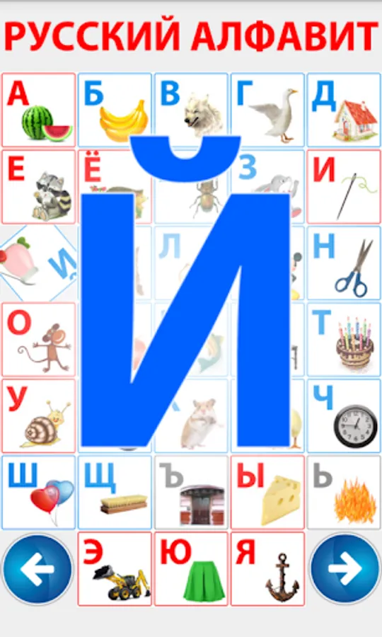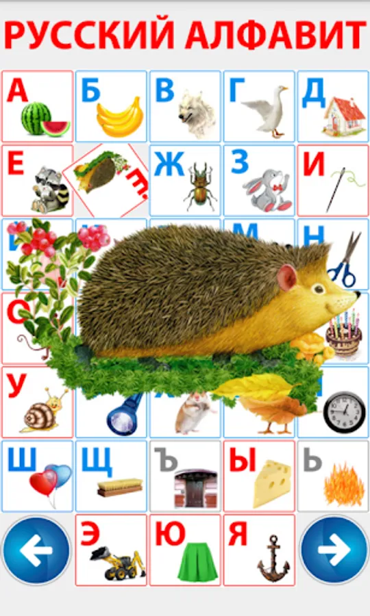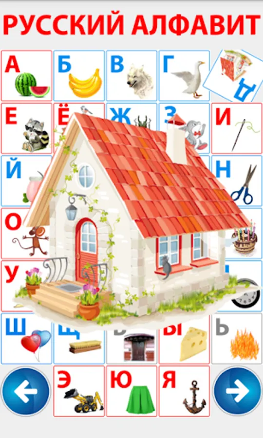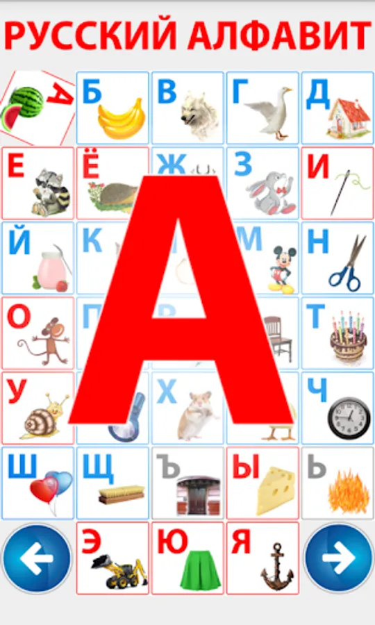 For preschool children. This fun application, the child learns through play alphabet. Colorful pictures and simple menu will allow children to learn the Russian alphabet independently. Each letter is mapped to the picture whose name begins with that letter.