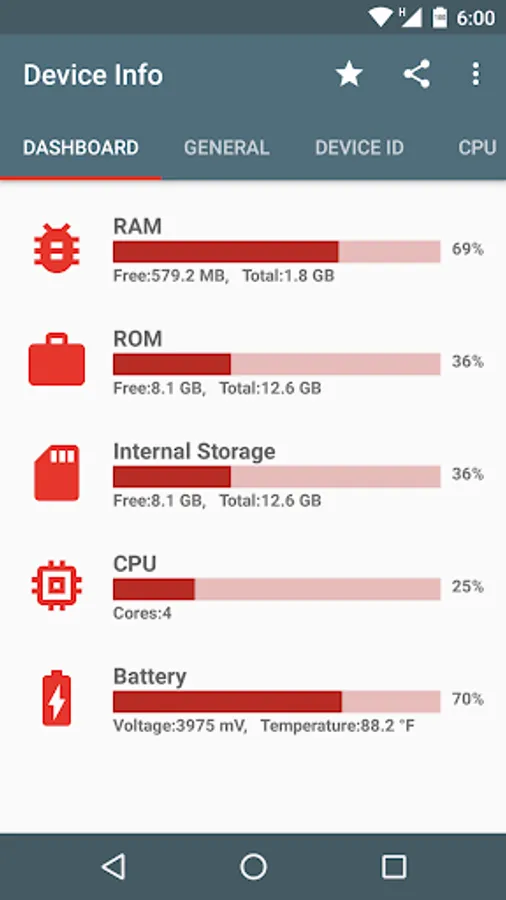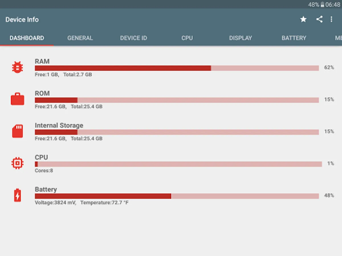 Device info application is the most comprehensive, powerful and fancy app that provide you with all the information you need to know about your phone, system and hardware with the most attractive and beautiful user interface (using Material Design).