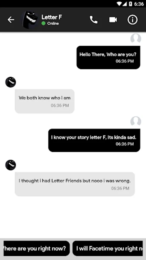 • live chat and live video calls with scary Letter F Alphabet Lores.