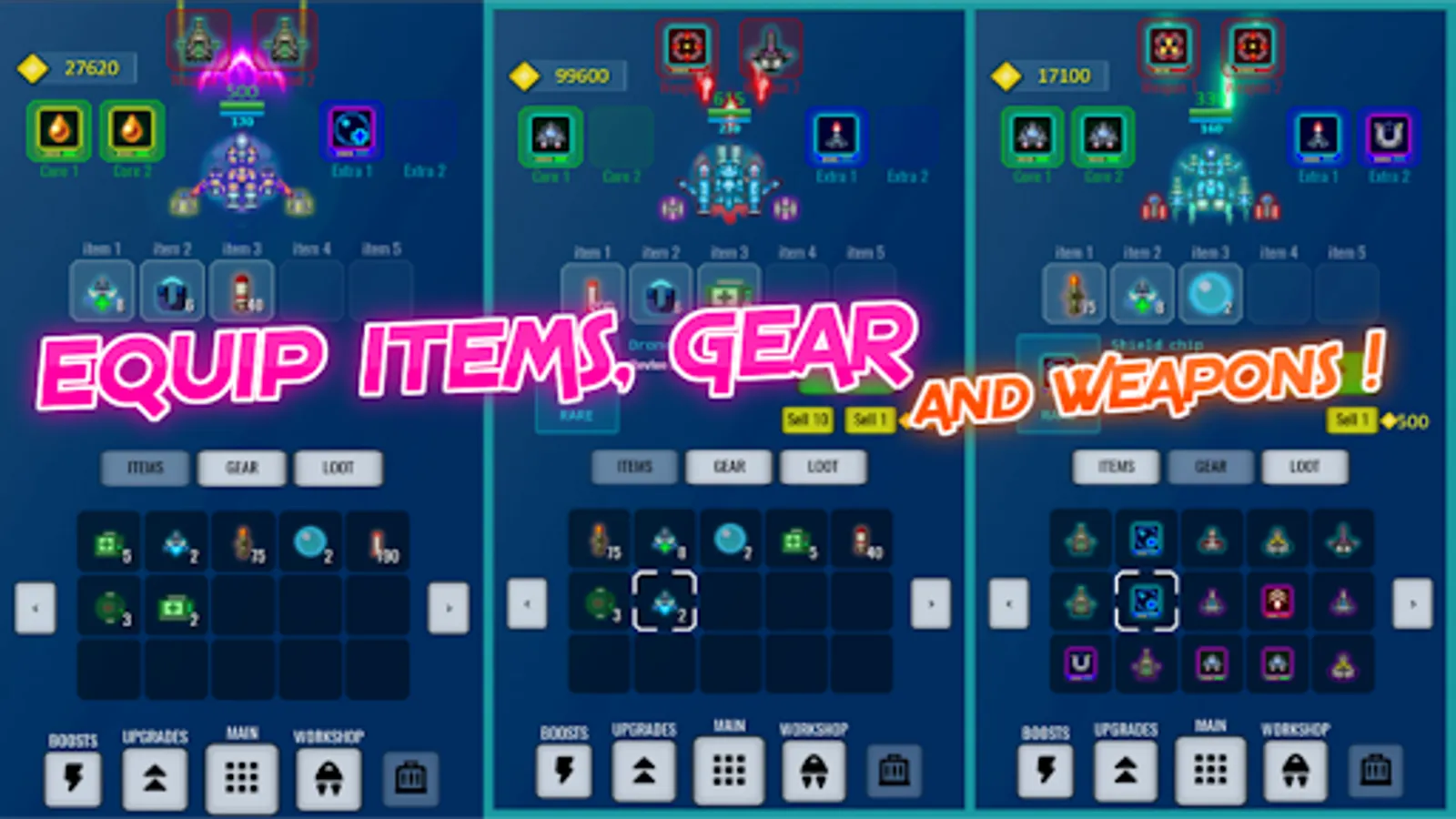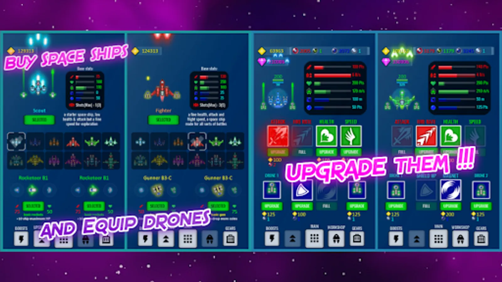 - Dozens of starships: Attack with different guns, lasers and missiles