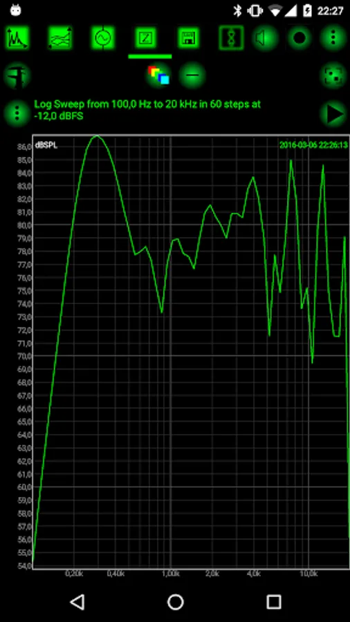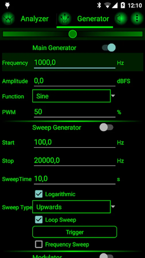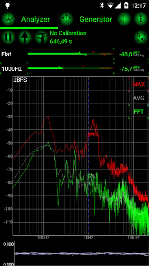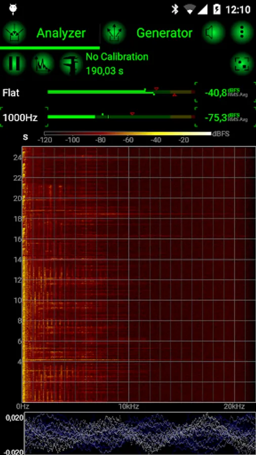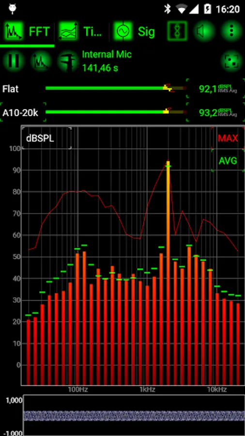 This Software records audio with 44.1 kHz from the built-in microphone of the mobile phone or from an external microphone and visualizes the signal as spectrum. It also contains a Signal generator for sinusoidal or other waveforms.