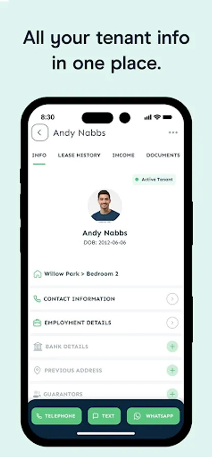 Click to call, text or email straight from the tenant or supplier contact information.