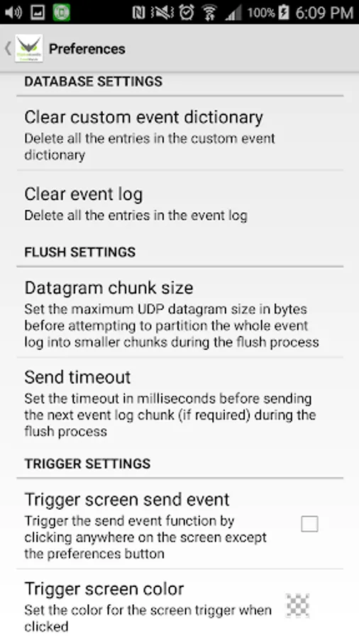 Additional features can be accessed in the preferences screen by tapping on the gear icon. Some examples are event geo-tagging and sound/color trigger flashes for accessibility.