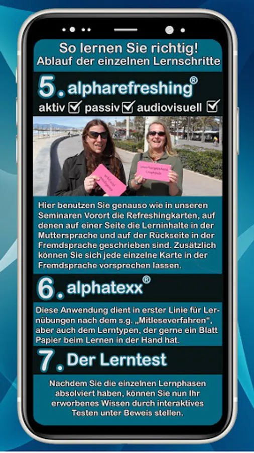 This mobile learning variant is also based on the learning phases of the successful and award-winning Alpha Institute method and guarantees you maximum learning success.