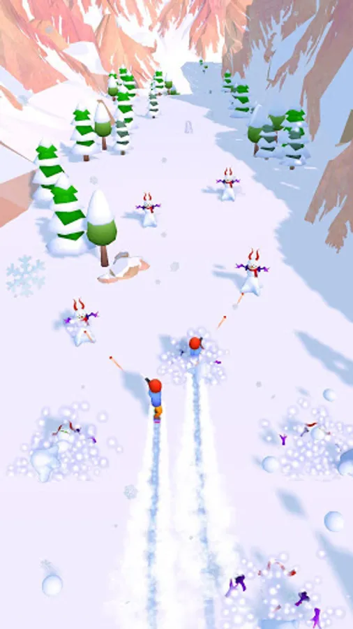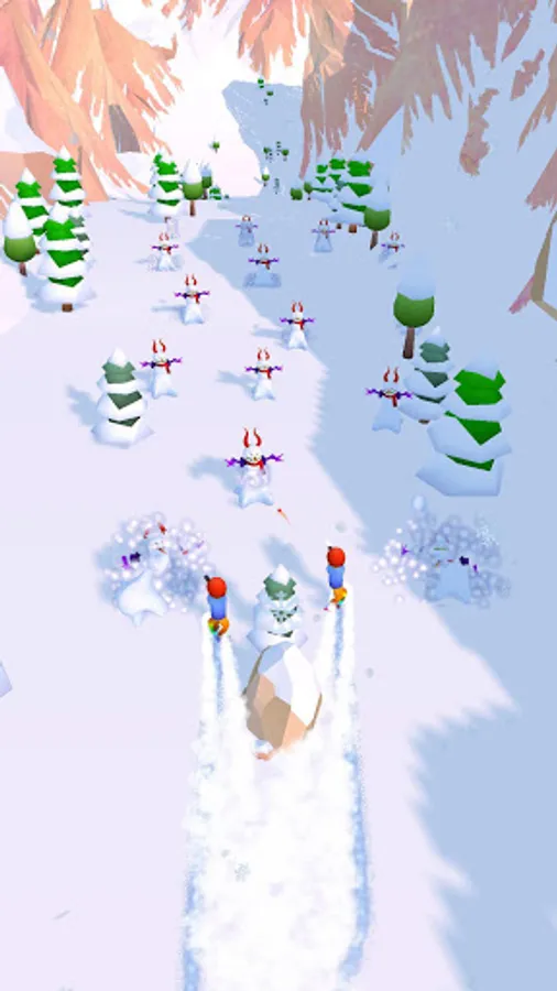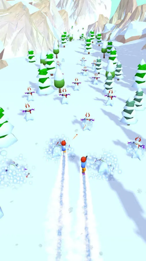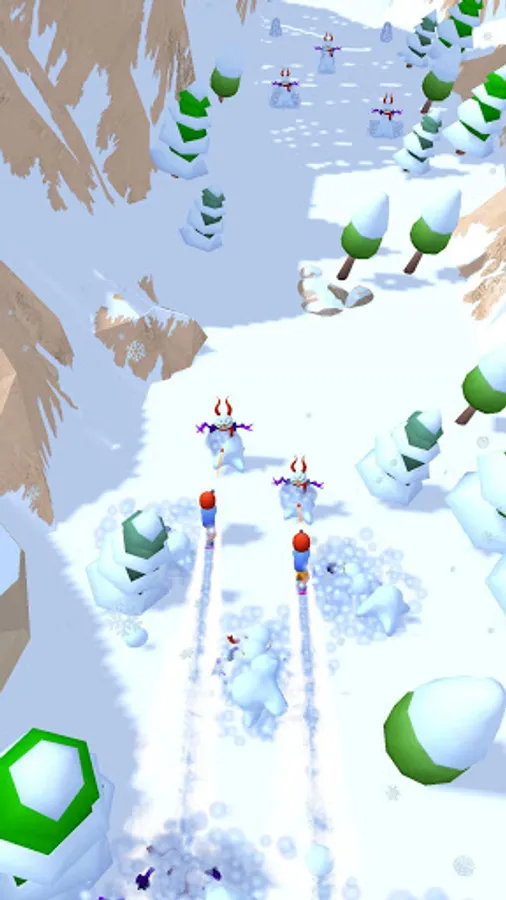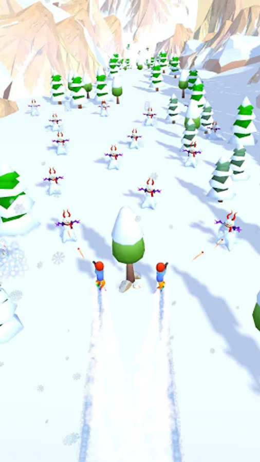Ski down a snowy mountain in pair. Avoid obstacles, shoot down evil snowmen- don't leave anyone behind!