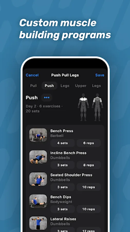 Experience gym workout plans backed by science, tailored to your objectives and needs. With Alpha Progression, you can choose your training frequency and target muscles during your gym workouts. For both men or women, our app creates personalized strength training plans to elevate your gym workout & muscle building journey. You can create your own plans for added customization.