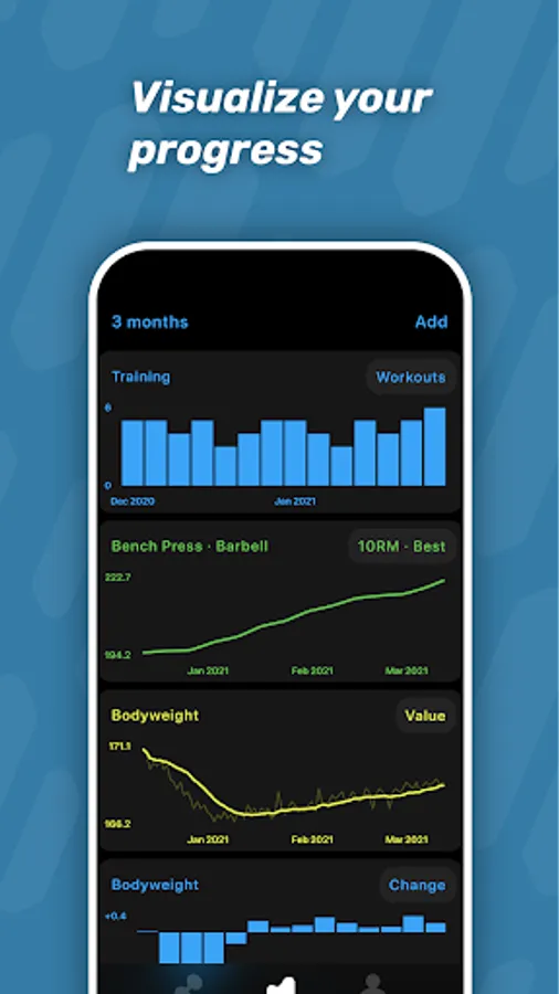 Optimize your strength training with our graphs and insights. Visualize your workout history, and analyze how your muscle building and strength training have evolved over time thanks to the gym tracker.