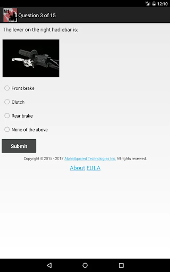 This app will help you get your written test done. It focuses strictly on motorcycle-related questions (don't waste time on basics of driving theory!) for the exam and covers all the important information from Motorcycle Handbook. Check yourself or learn faster with quizzes.
