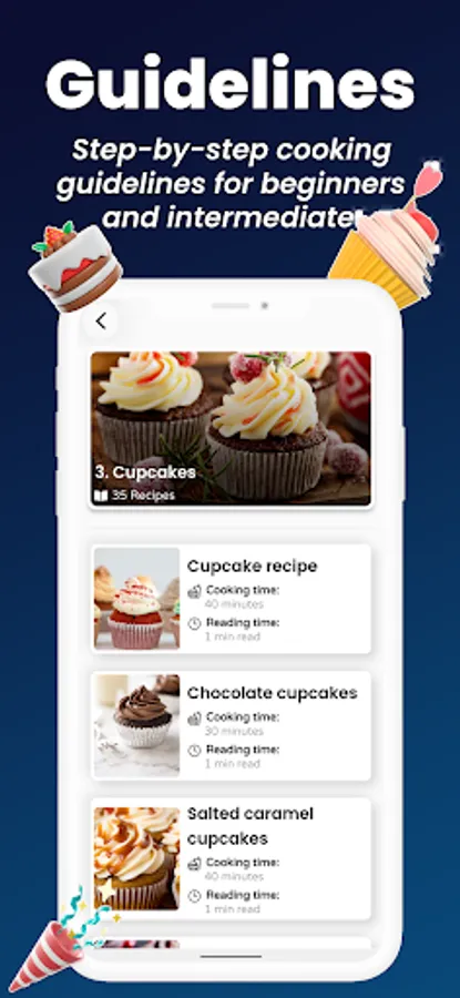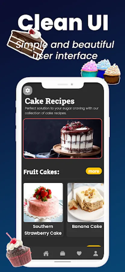 There is also a categories of cupcakes in our app. Our app contains a lot features that can help you in cooking. there is also a dark theme in our Cake Recipe app.