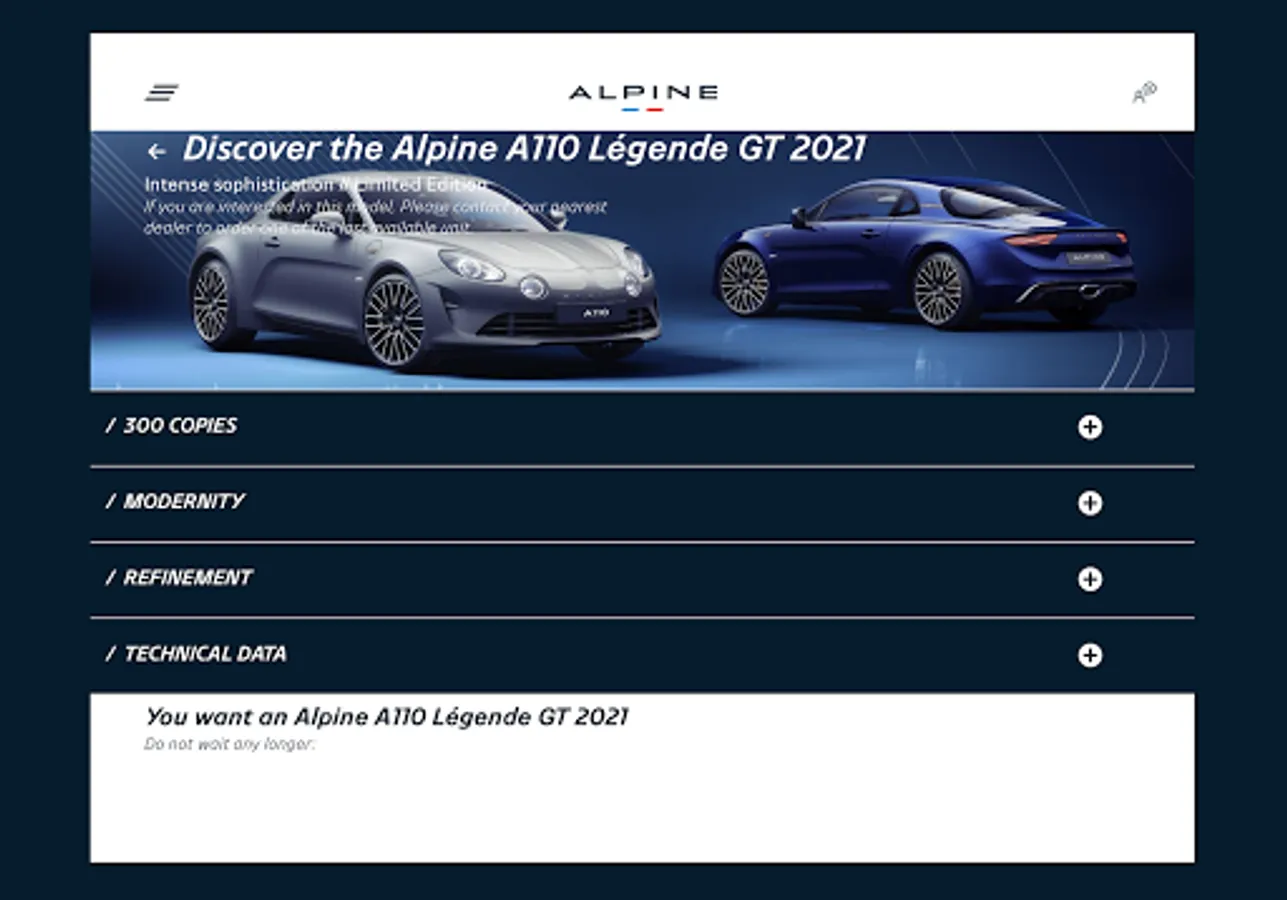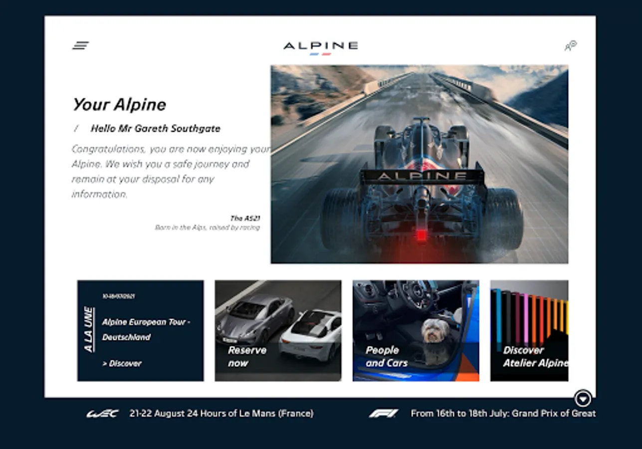 Inspired by Alpine’s rich heritage, the A110 places driving pleasure front and centre. You can immediately book your Alpine A110 Pure or A110 Légende through this Application.