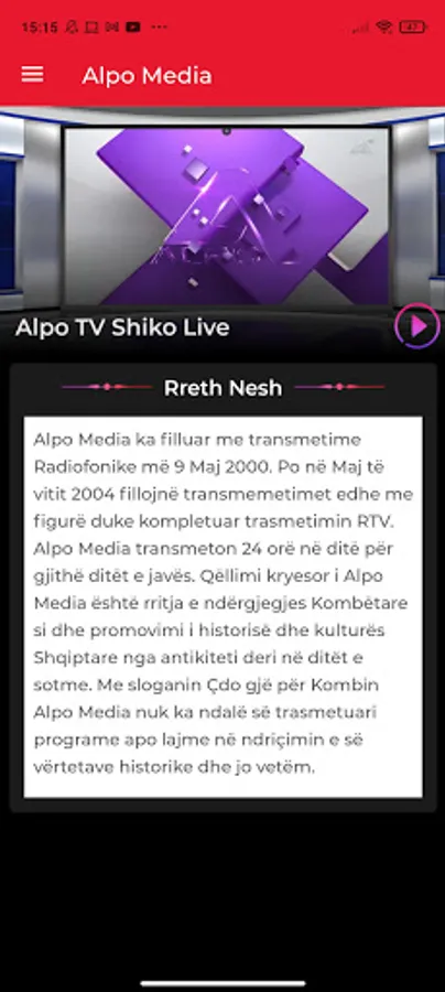 Alpo Media started with radio broadcasts on May 9, 2000. Also in May 2004, the broadcasts with pictures started, completing the RTV broadcast. Alpo Media broadcasts 24 hours a day, seven days a week. The main goal of Alpo Media is to raise national awareness and promote Albanian history and culture from antiquity to the present day. With the slogan "Everything for the Nation" Alpo Media has not stopped broadcasting programs or news in the light of historical truths and more.