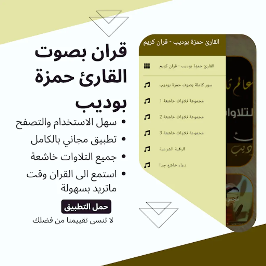 And you can download a complete Holy Quran with the voice of Hamza Boudib without the net to your mobile phone easily and conveniently through one application that provides you with a complete Holy Quran with the voice of Hamza Boudeeb without the net